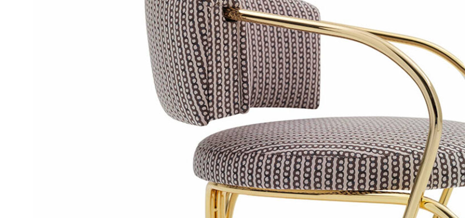 The innovative architectural structure of the A-Round armchair is created by a dynamic flow of tubular parts. The rounded rear is covered with fabric or leather with Oval Logo embroidery. Steel armrests and legs finished with gunmetal grey or polished brass.