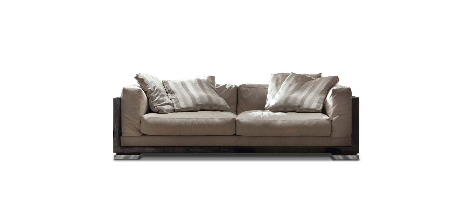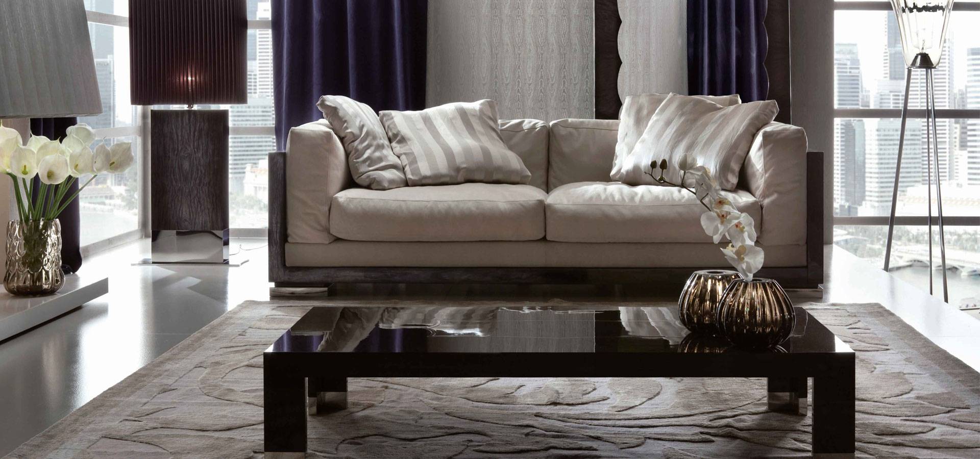 Fixed couch in high gloss polyester finish with moka japanese tamo burl veneer.