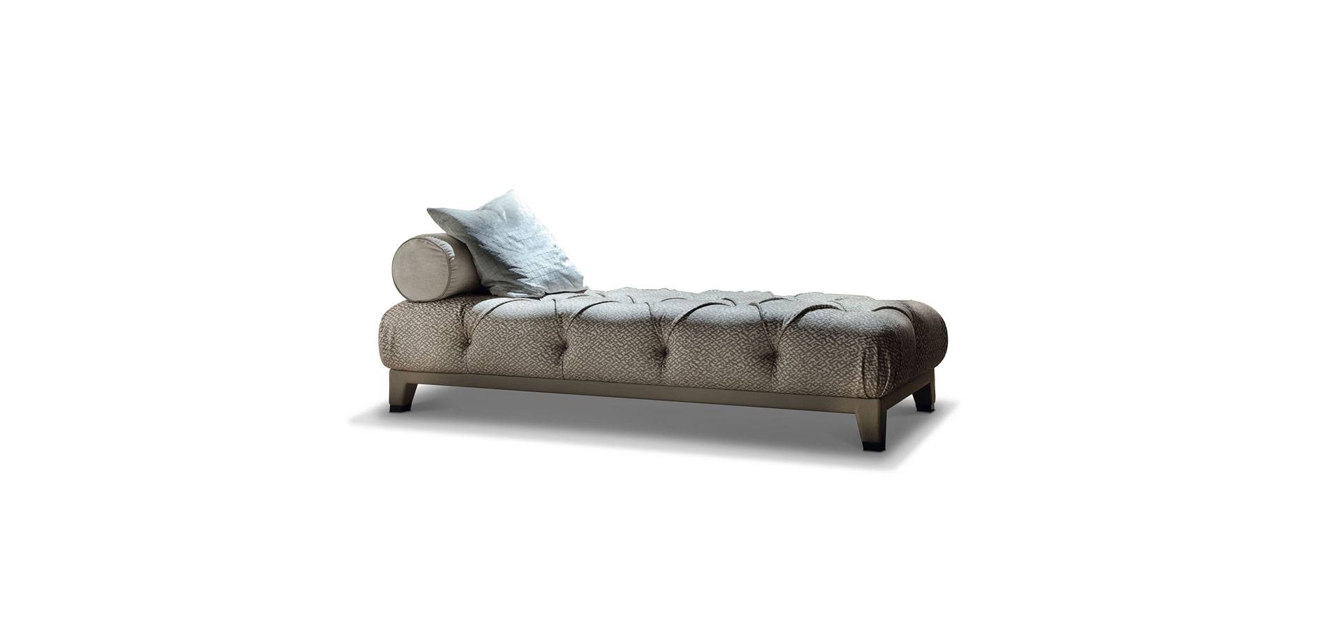Masami chaise longue with down feather seat in polyurethane foam. Seat is buttoned. In a storm dark grey colour, the base is made of leather and stainless steel.