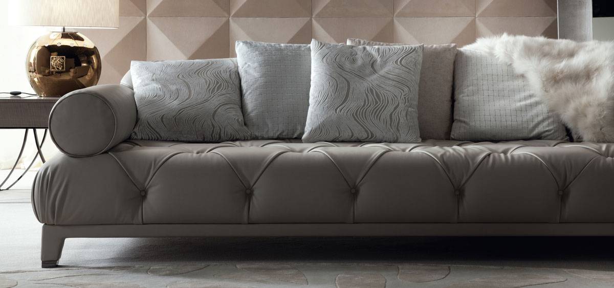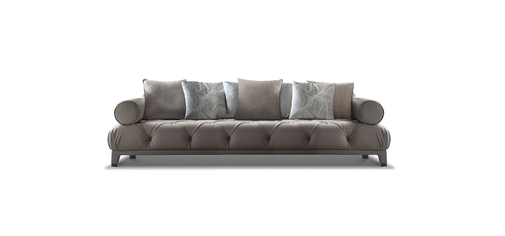 Masami fixed couch seats have polyurethane foam seats coated in down feathers and six back cushions filled 100 percent . Seat is buttoned. In a storm dark grey colour, the base is made up of leather and stainless steel.