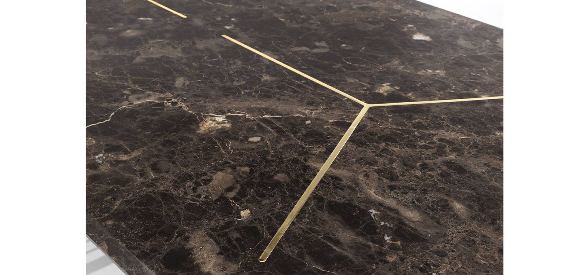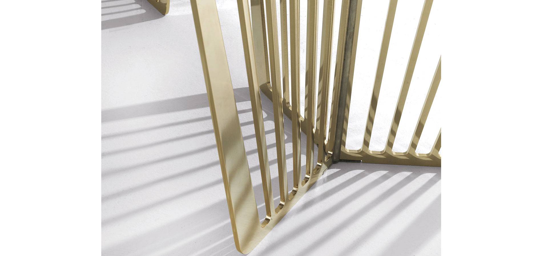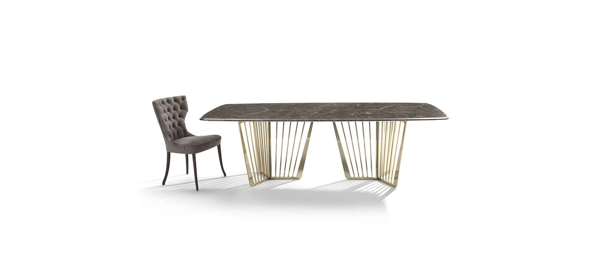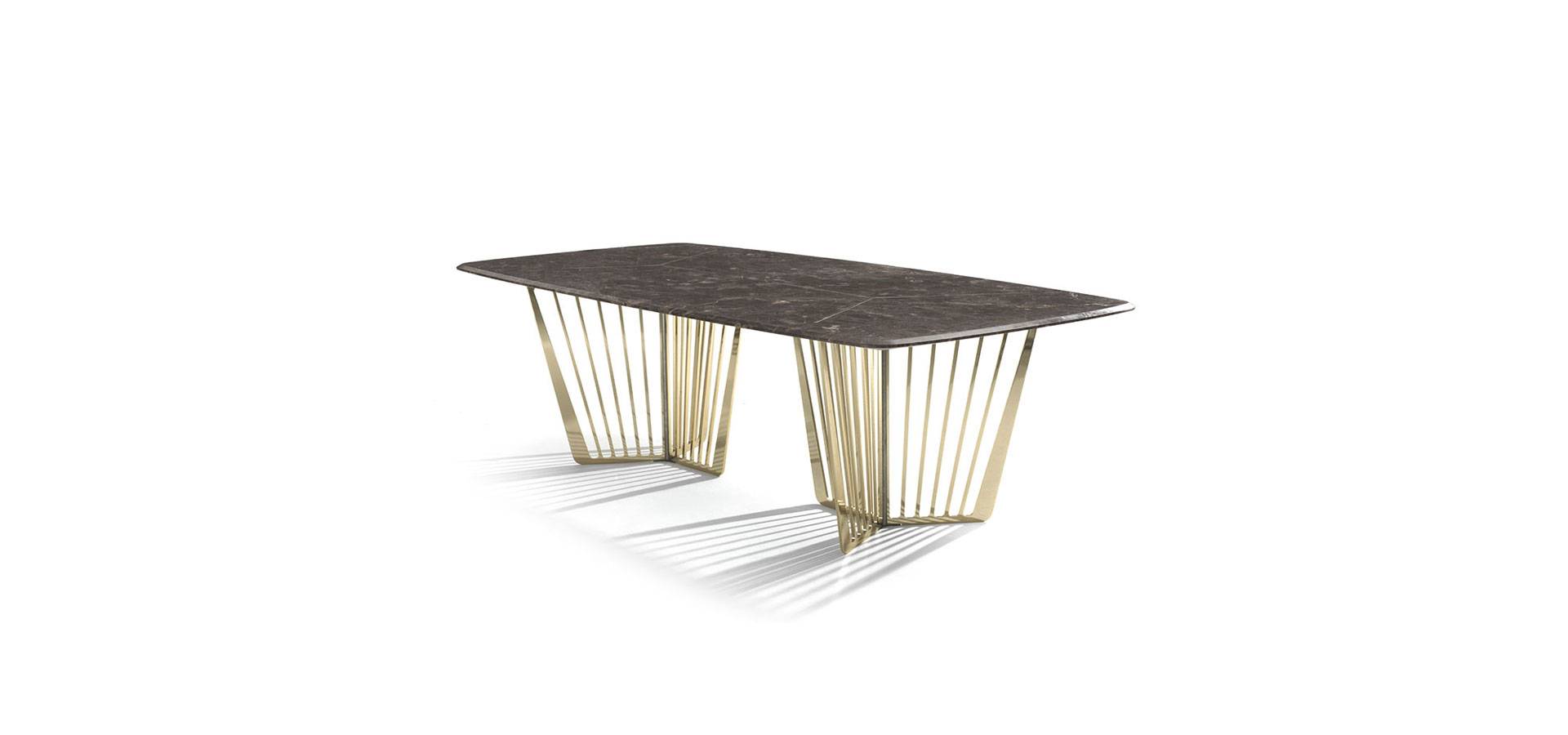 The contradiction of lightness and solidity is realized in the Alfieri table. A vertical pattern distinguishes this metal foundation, which alternates between solids and voids. Marble, a valuable and refined material, is used for the top, which comes in a variety of sizes. The inlay on the top, which mirrors the lines of the base for a visual illusion of continuity, creates an unexpected final appearance. The Alfieri table, in all its glory, adds an exquisite and refined touch to any setting.