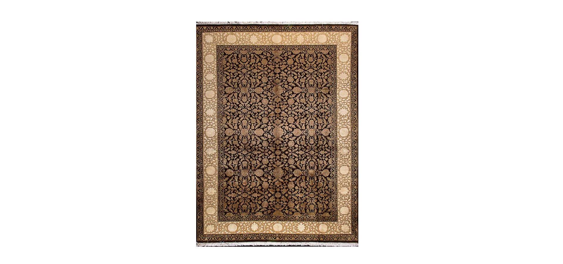 Handmade Indian wool and silk rug with a repeating abstract pattern, very high density, on a black background with a beige silk embossed border. All designs are embossed. Ideal for a modern space too!