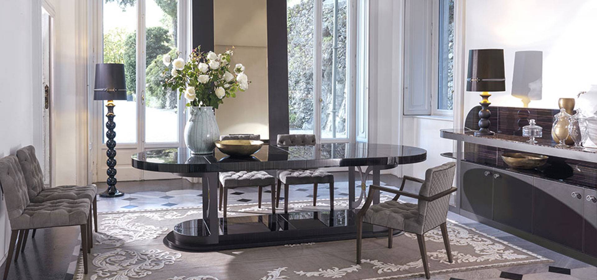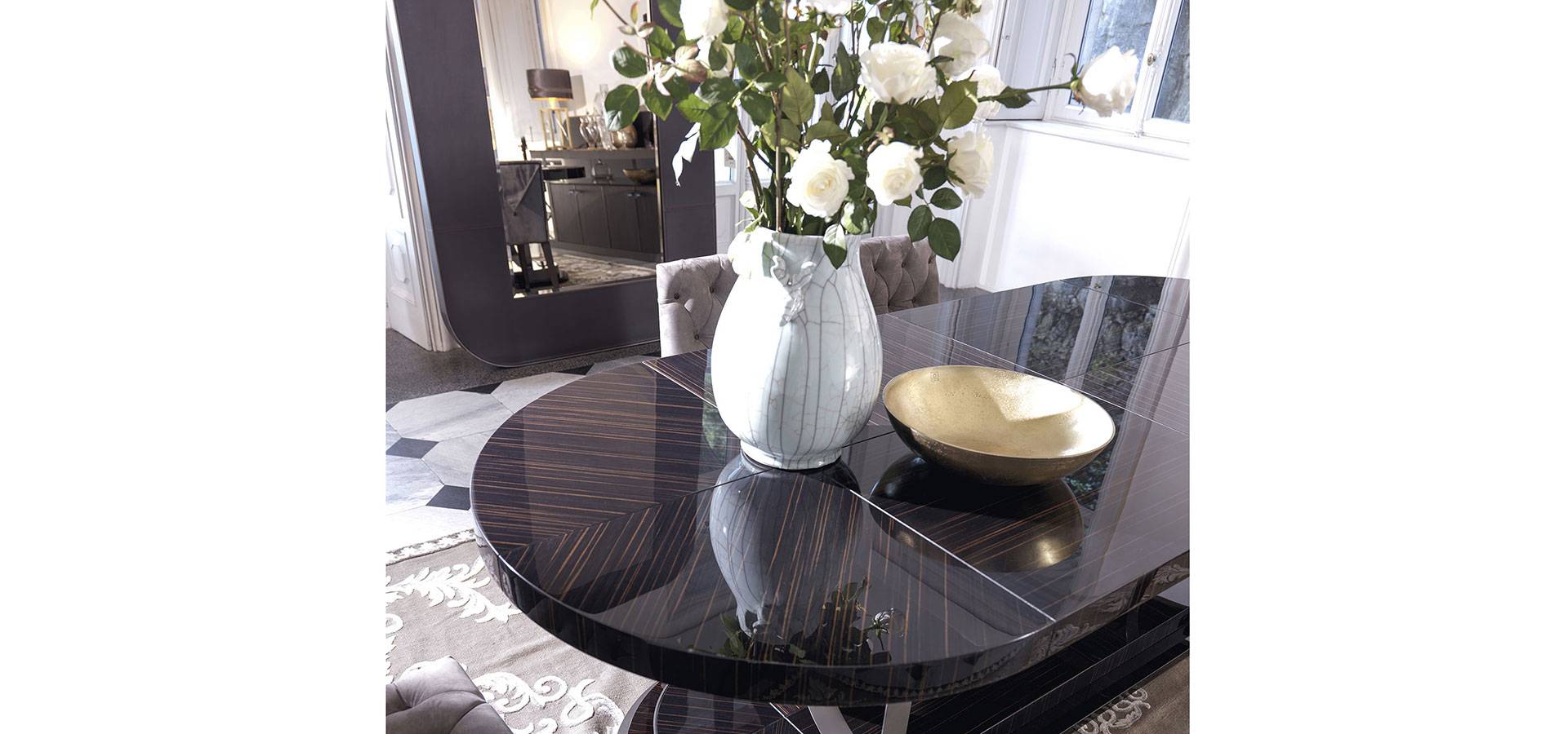 The Aragona table, with its wooden top and base, plays with proportions and geometries in a wonderfully balanced contrast, as seen in the rounded top shapes, which emphasize the geometric inlays even more. Metal legs in the Vittoria Frigerio collection's rich finishes accentuate a play of shapes that reflect the top. The VF logo in the middle of the legs underlines the table's uniqueness and proportions.