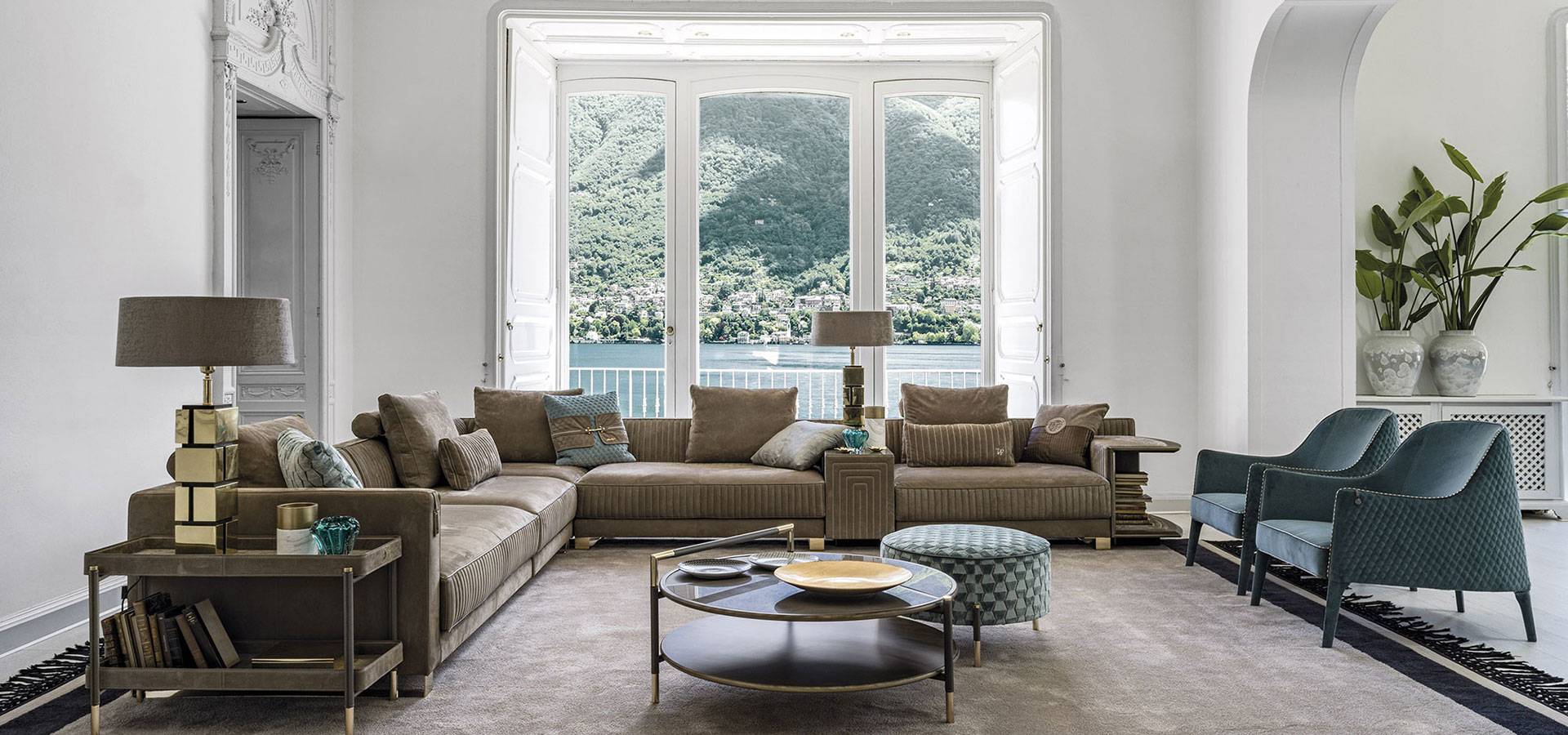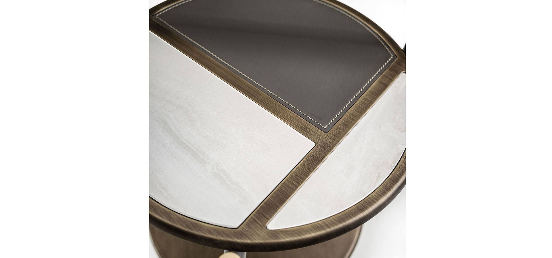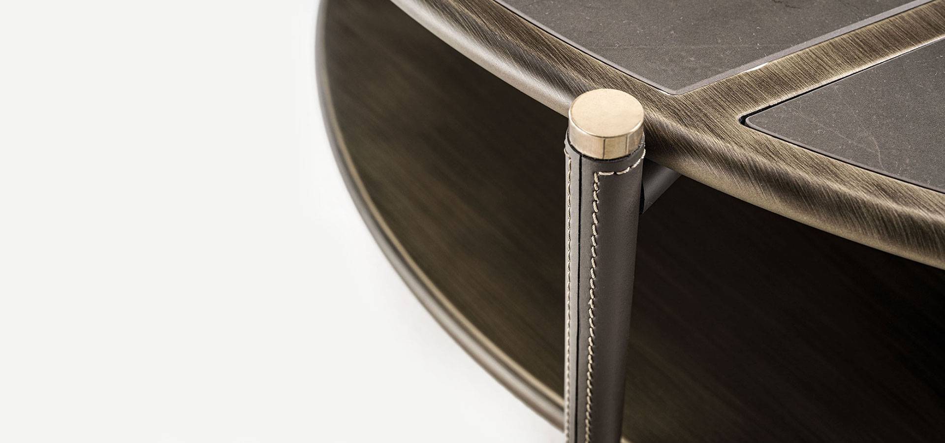 The harmony of materials, textures, and colors is the product of meticulous research and the capacity to dare while keeping loyal to oneself. The Araldo coffee table family offers a variety of bright and cheerful furnishing options without sacrificing quality, improving finishes and features distinctive of the Vittoria Frigerio collection and embellishing every detail. The top and lower shelves have bronze patinated wood profiles, and the top has porcelain stoneware inserts with marble and leather effects, the latter repeated on the framework and details in gold chrome. Various materials combine for a refined finish in shapes that add simple elegance to any space.