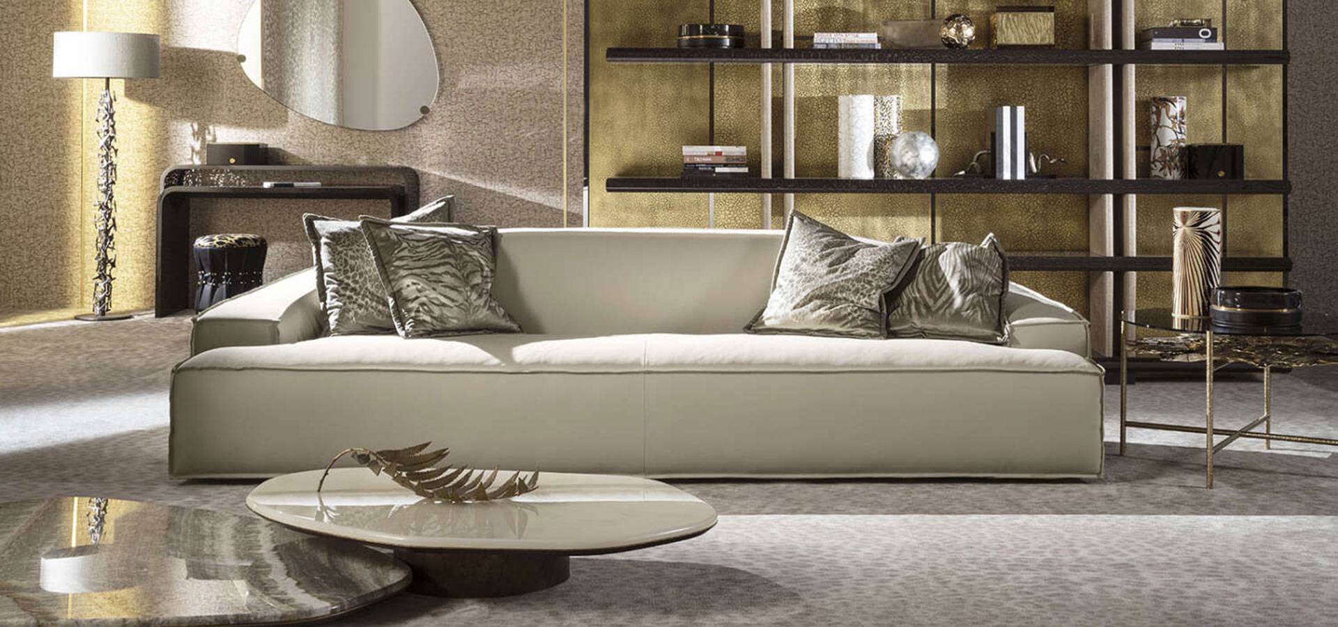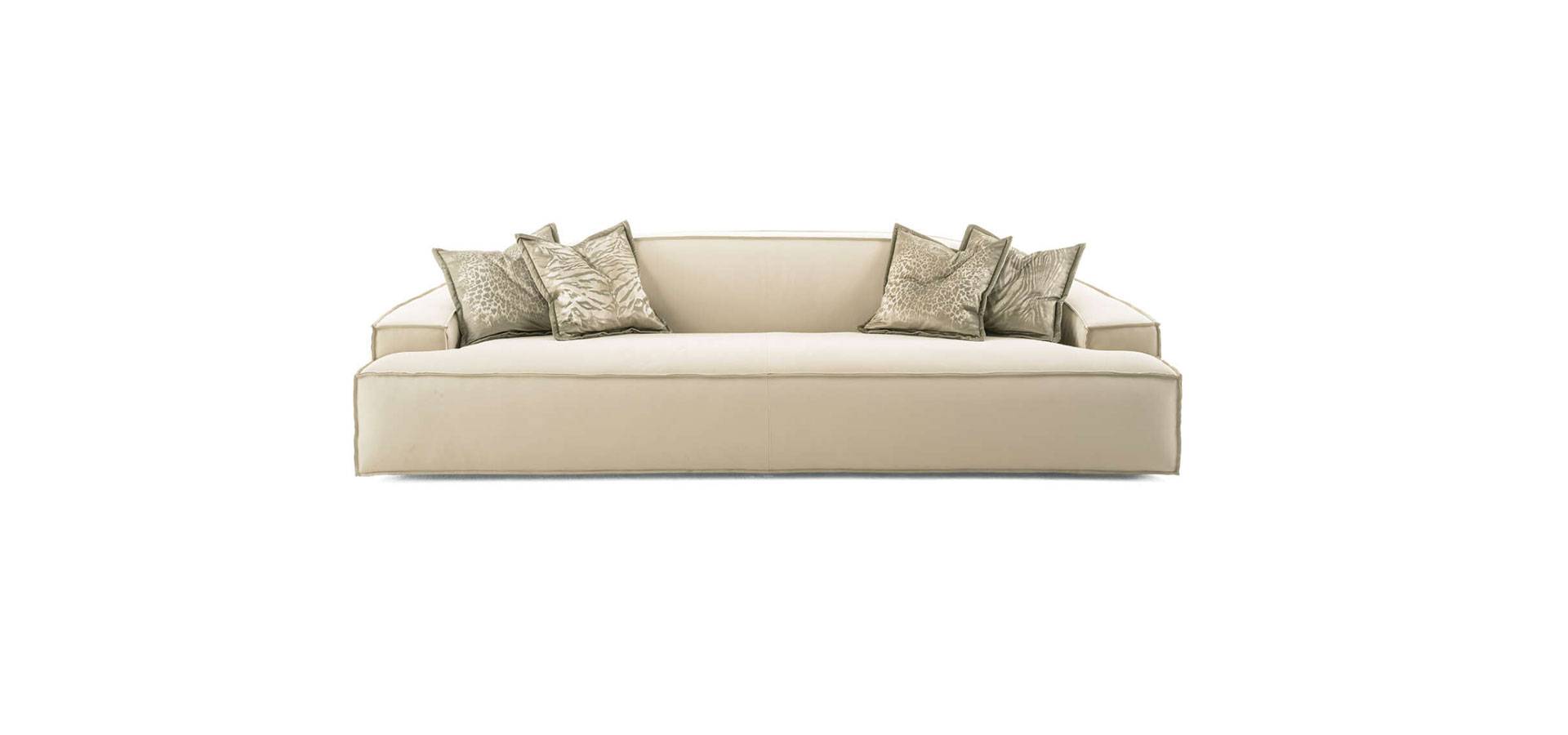 The soft leather upholstery in a delicate shade of beige with decorative stitching highlights its simple design and understated elegance, and the cushions by designer Fausto Puglisi with animal prints – declined this year in neutral shades for a refined tone on tone effect – complete the look by emphasizing its voluptuous volumes.