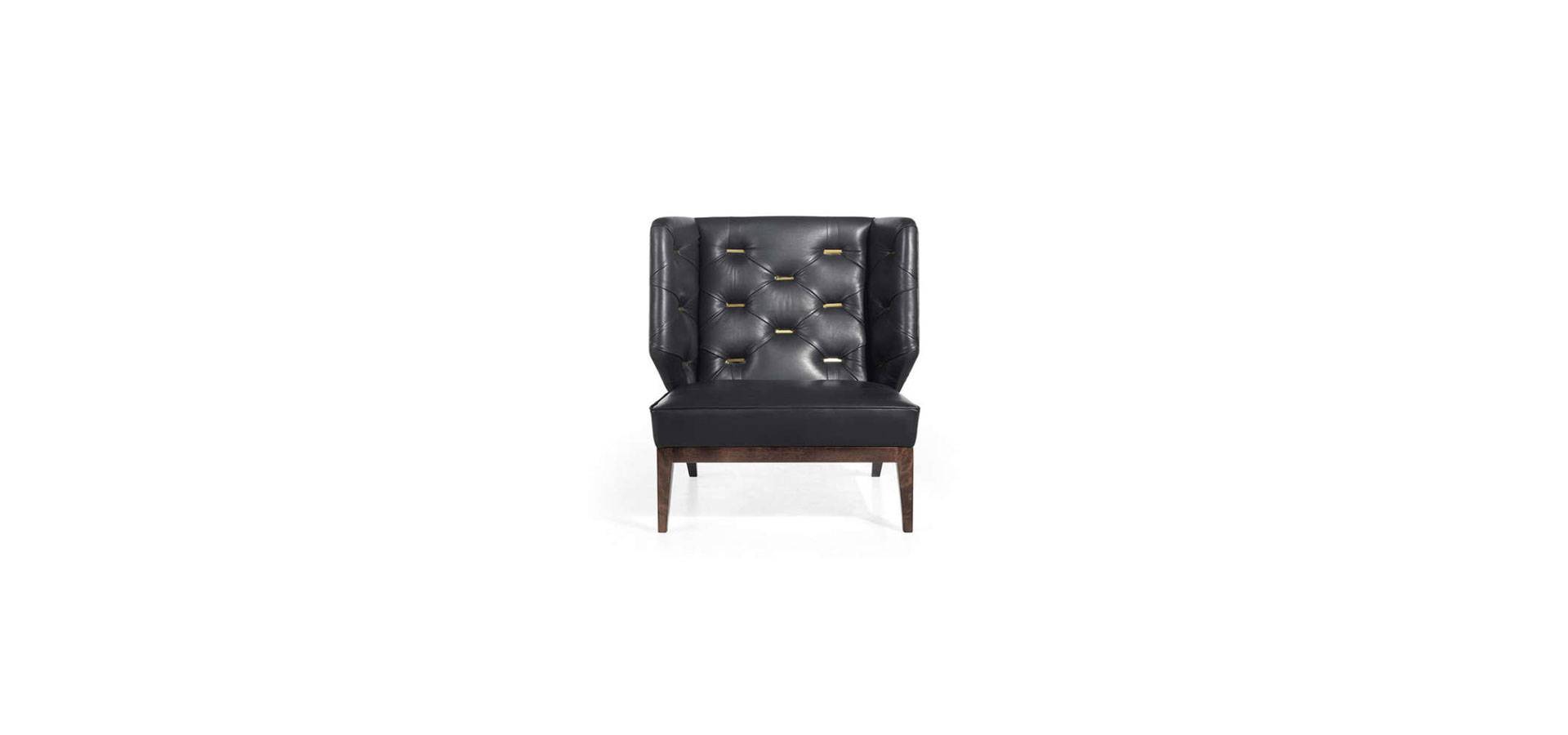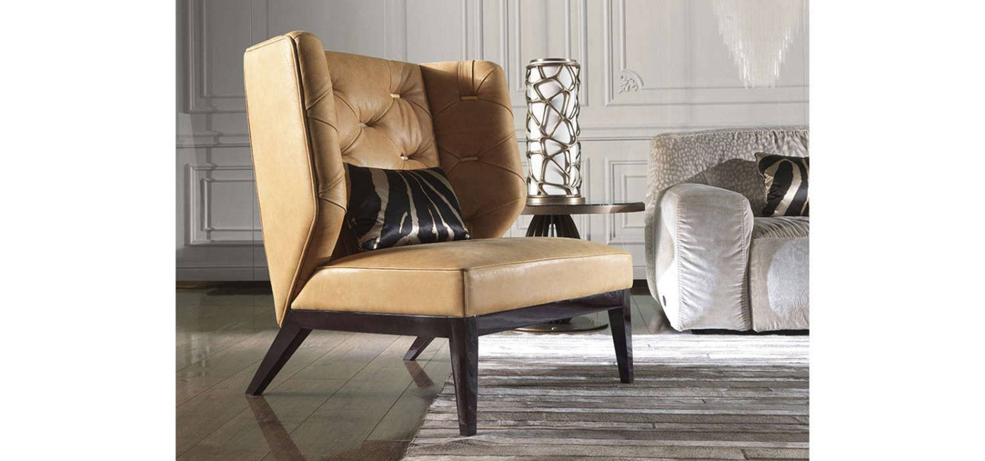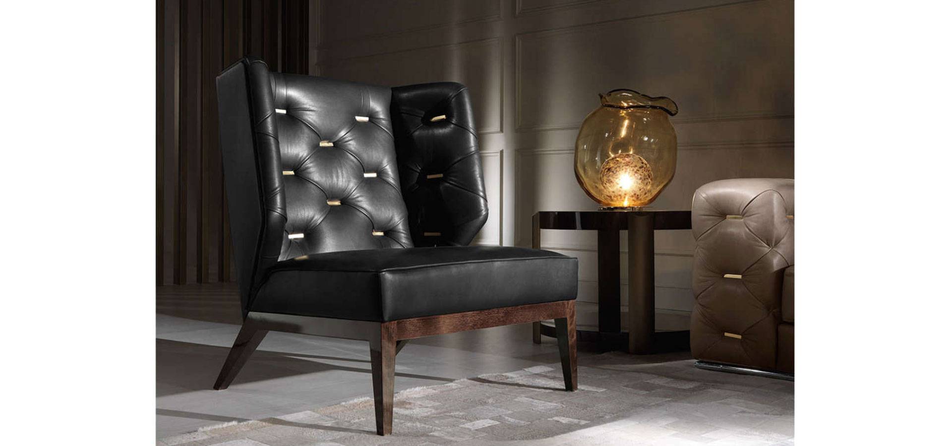 Foam and poplar wood construction. Upholstery from the range in leather or cloth. All of the collection's finishings are available for the internal back's metal plates in capitonné. One central RC metal plate with gold-finished Swarovski crystals. Base in wood with a lacquered or wengé finish.