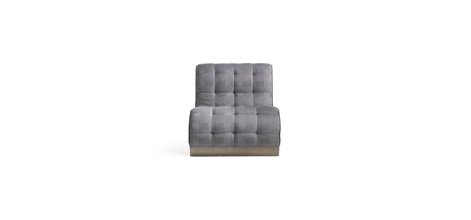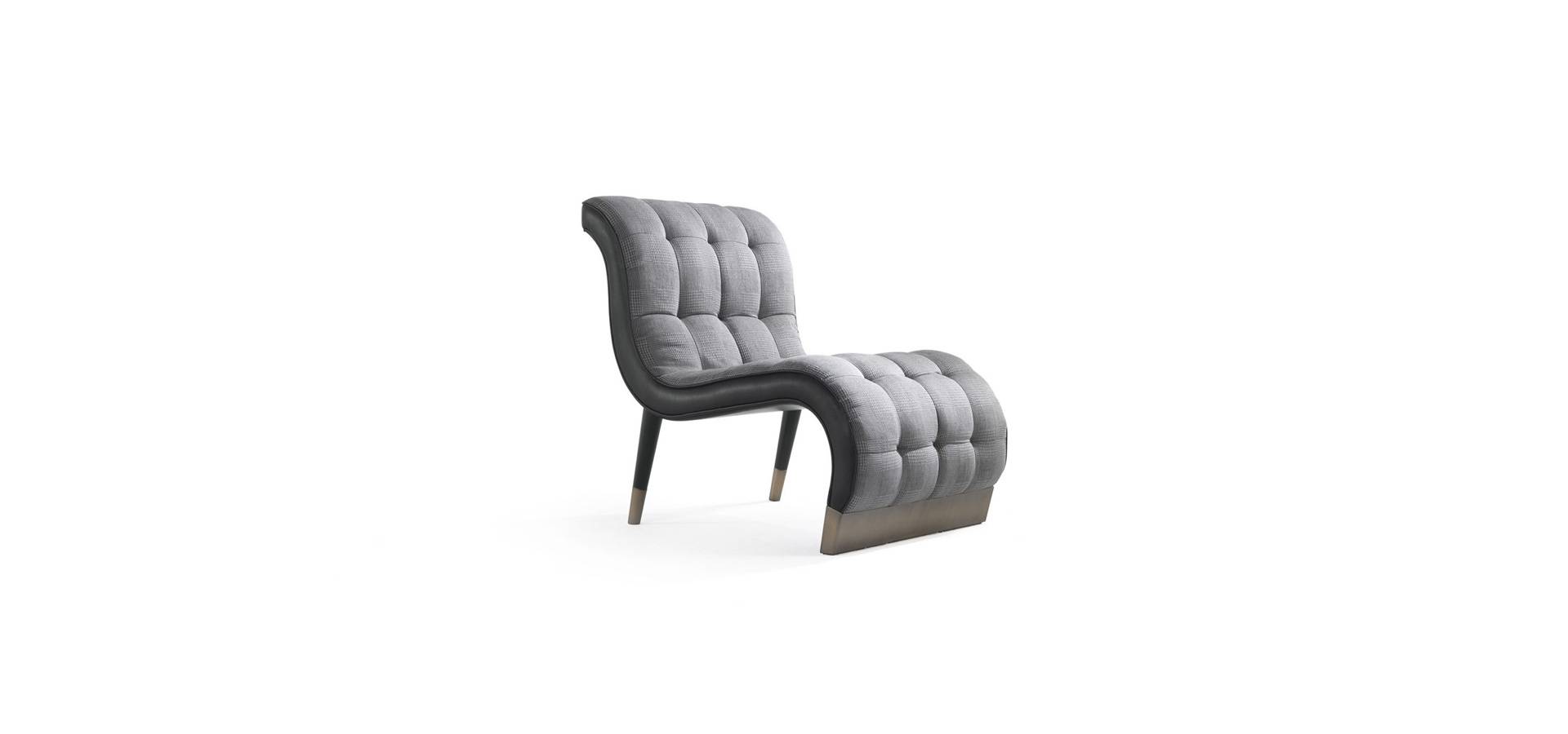 Bonnie has a unique shape that is halfway between an armchair and a chaise longue, with the back continuing on the seat and capitonné manufacturing on the entire frontal part. The Bonnie armchair is sophisticated and extravagant, with sloping back legs and bronzed brass tips that add a vintage touch to the overall look.