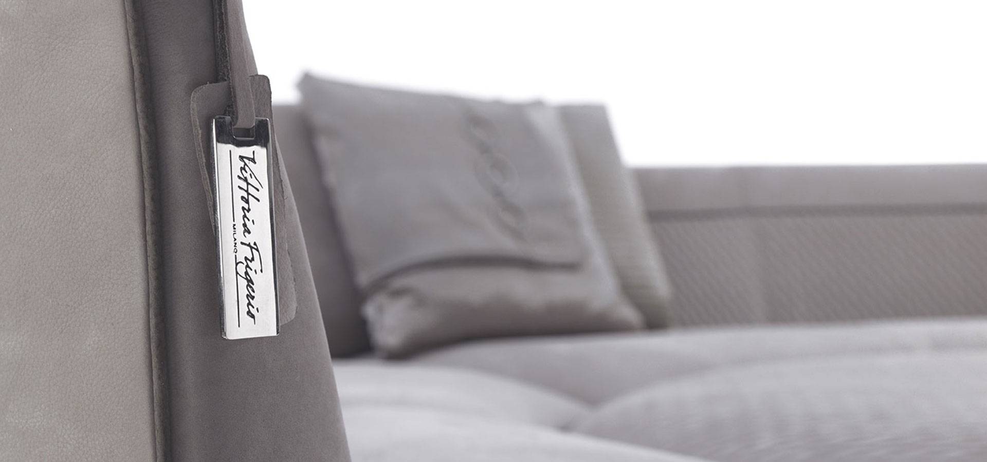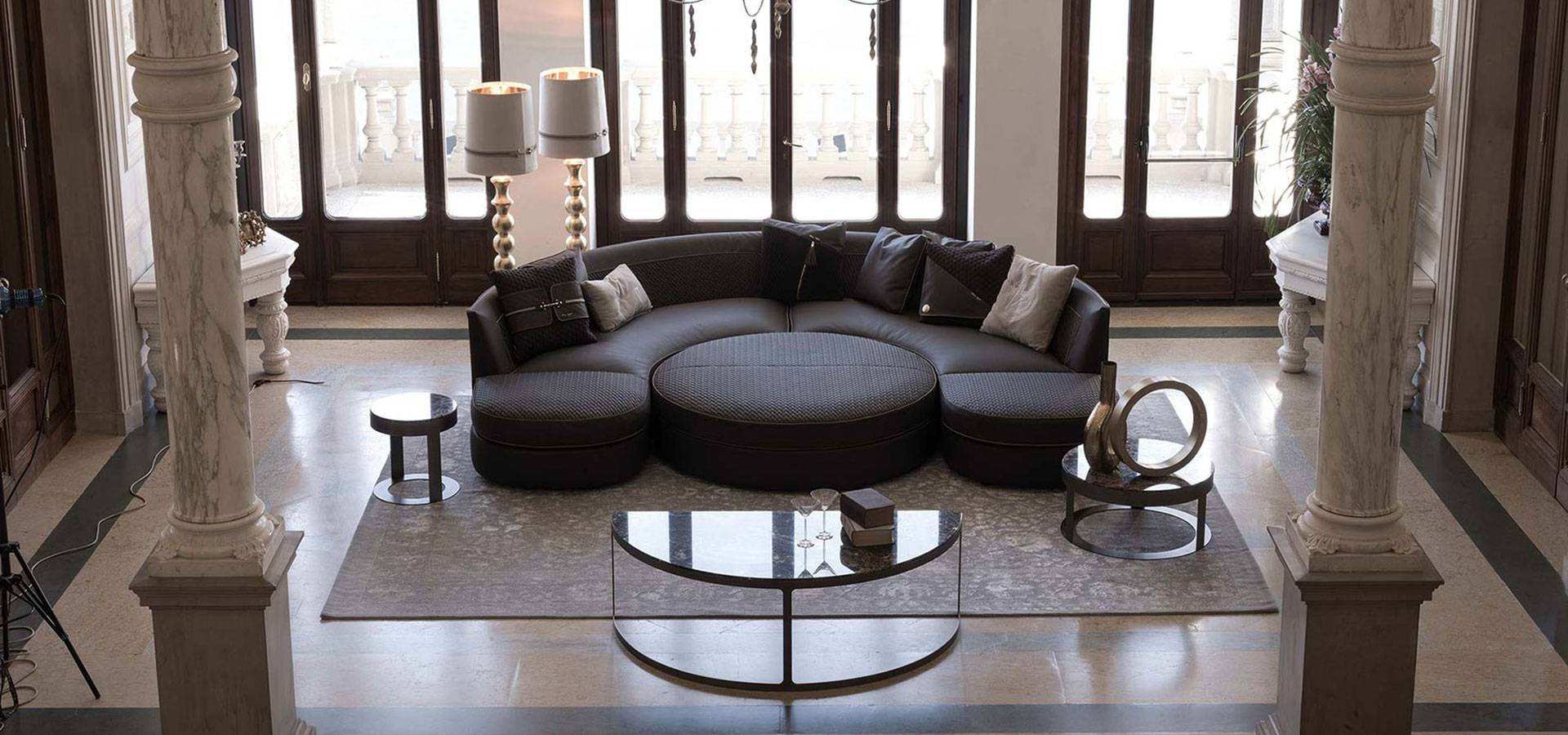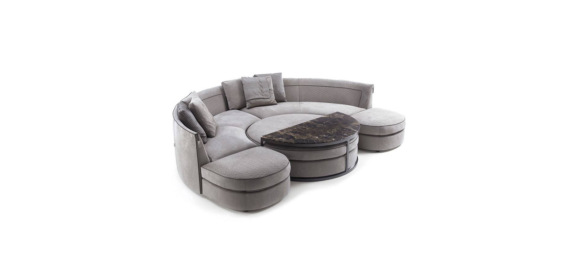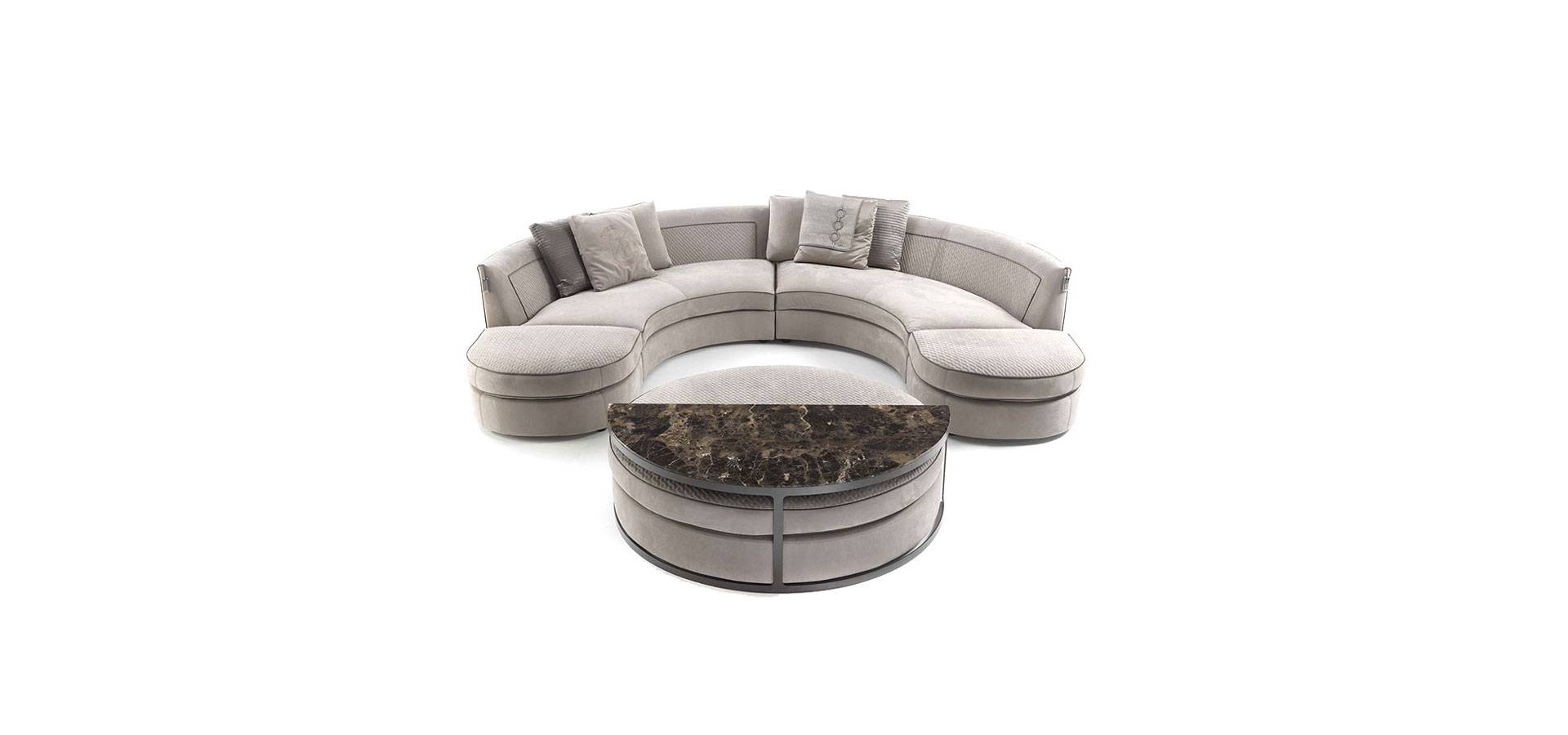 The Borromeo sofa is distinguished by its classic and contemporary taste, modern proportions, and exquisite and sumptuous elegance. The collection is divided into linear solutions with closed or modular couches, conventional corner solutions, and the iconic version with curved corner, round pouf, and matching semicircle-shaped coffee table. The devoted quilting inside the backrest and replicated on the surface of the poufs completed with a contrasting hand-stitched profile, while the rest of the sofa is finished with a polished smooth profile, is the collection's unifying element. A series of accessories, such as semi-circular coffee tables and island poufs with inserts in wood or marble-effect porcelain stoneware, round out the set.