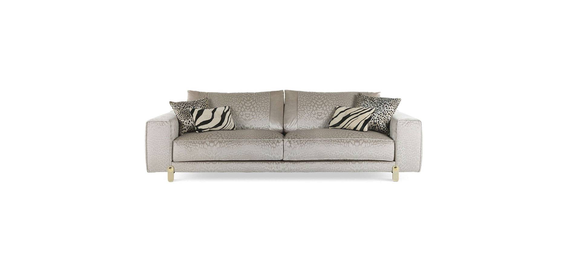 The straightforward, linear forms of the Caicos sofa are given a brazen, sensual charm. The collection's leather or fabric upholstery, which features recognizable Maison patterns like the animalier designs, combines with the shine of metal feet with the Roberto Cavalli insignia to provide a look that is unmistakably glam-chic.