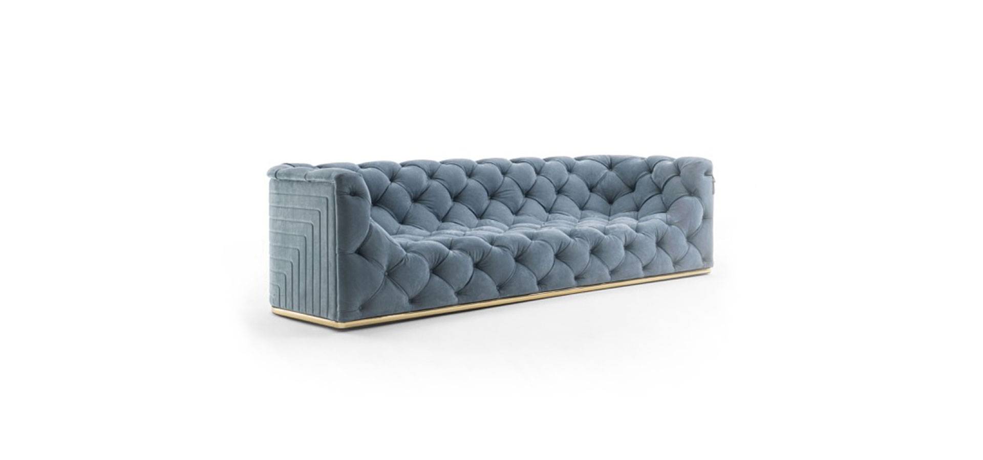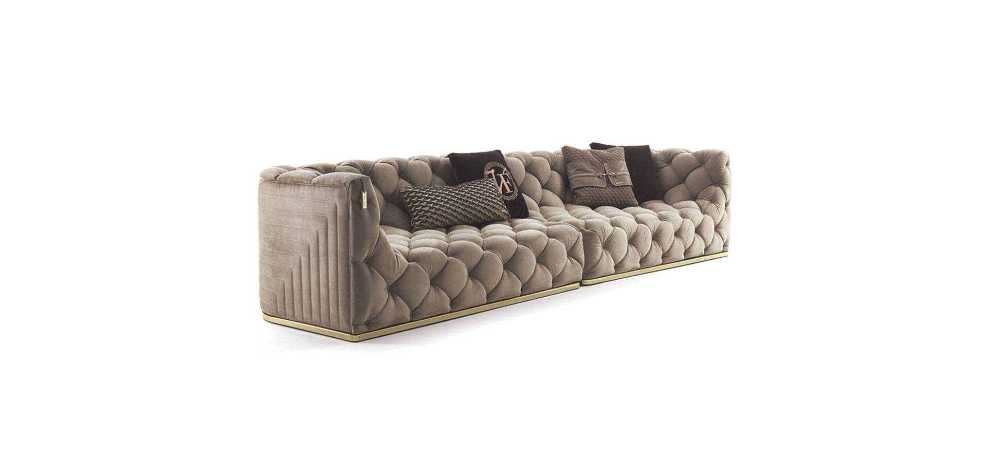 The Caracciolo sofa, with its distinct and familiar shape, is a masterwork of craftsmanship and dexterity that finds its pinnacle here. The rounded curves of the buttons create soothing waves on which to lean, contrasting the outward structure with the quilting's strict lines that encircle the sofa's back. The Caracciolo couch comes in a variety of configurations, including closed two or three seater sofas, modular elements with central elements, end elements, chaise longue, and dormeuse.