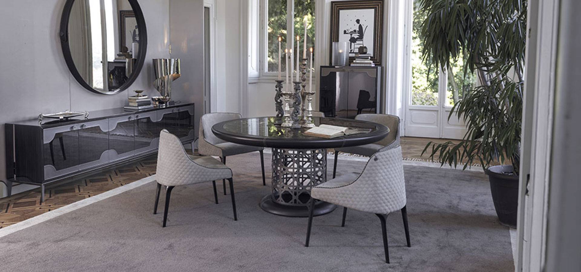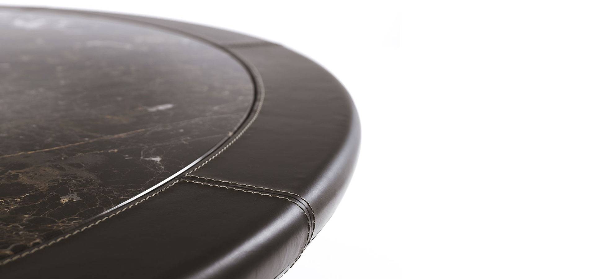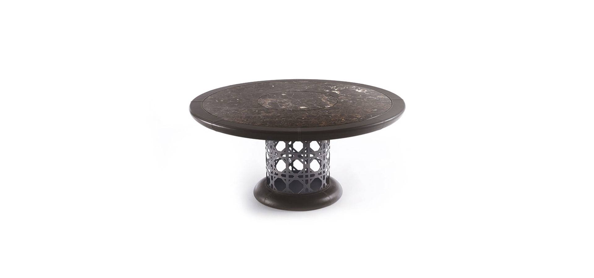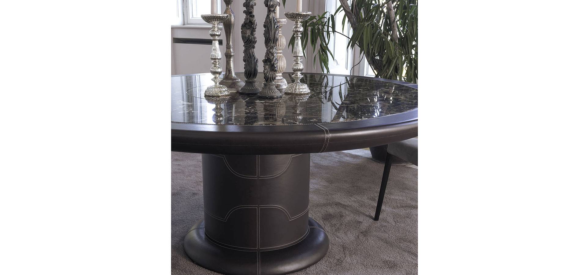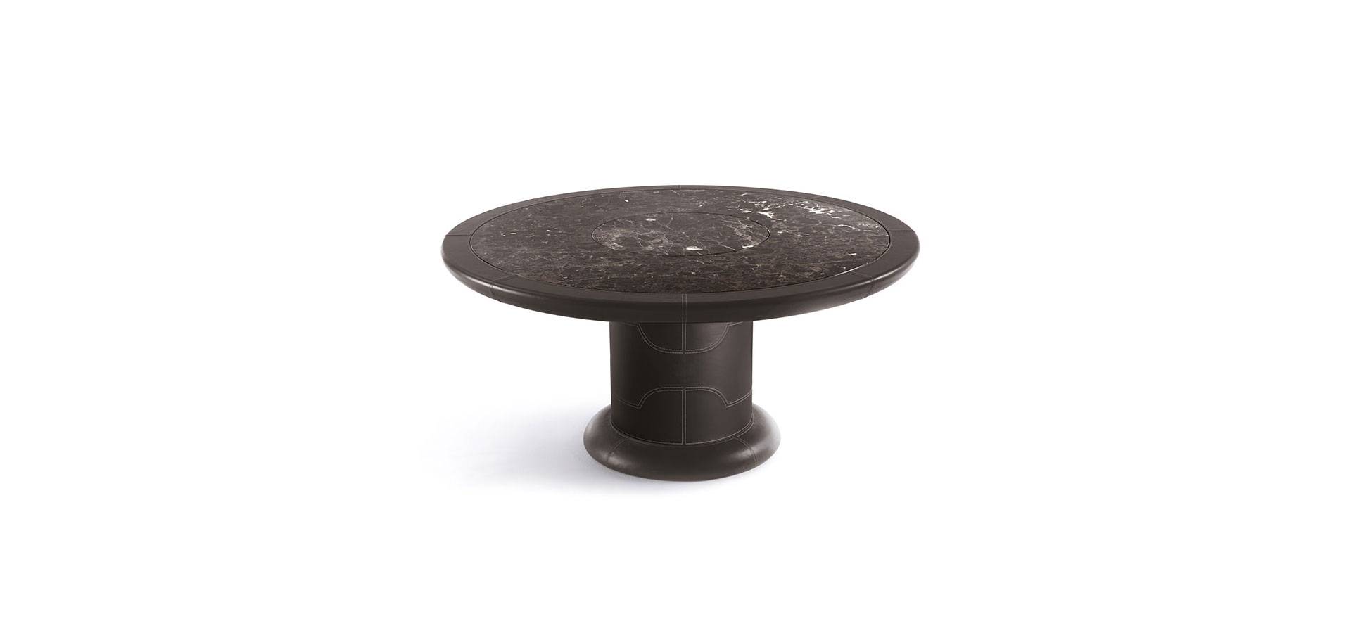 The Crespi dining table set features two bases: the METAL version features a geometric pattern in painted metal in the VF collection's colors, and the HIDE version features a leg and base on the ground wrapped in leather with contrasting stitching. The marble or marble-effect porcelain stoneware top is encompassed by a leather-covered wooden profile with contrasting stitching, emphasizing the Vittoria Frigerio collection's sartorial ability. The table's Lazy Susan top is made of the same material as the top.