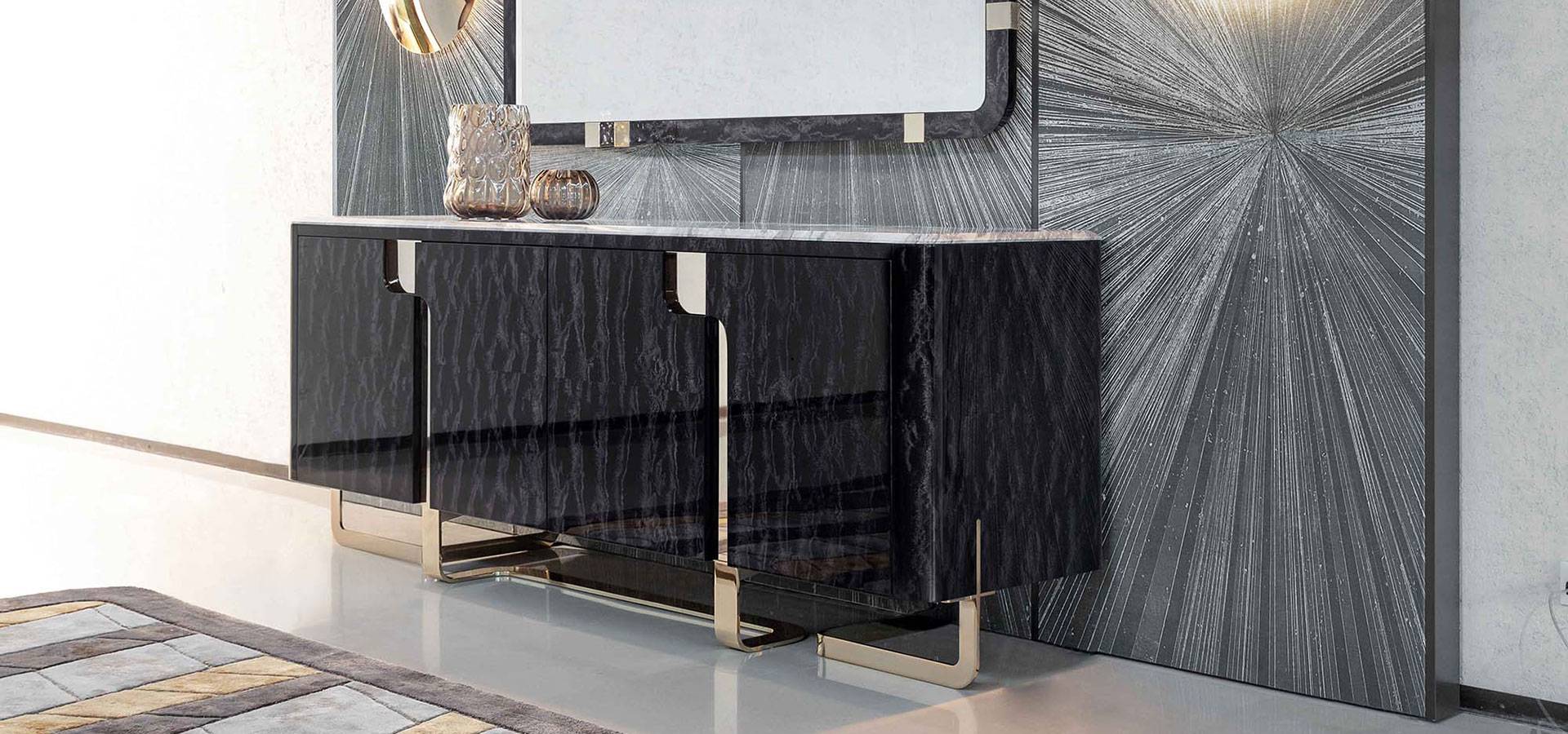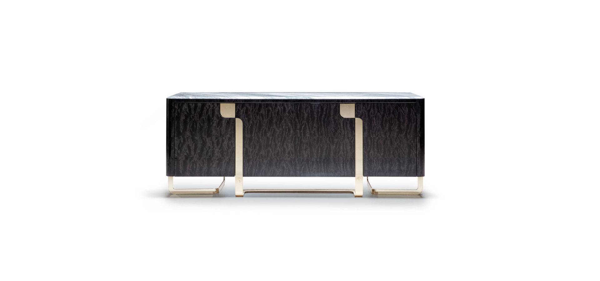 Black Bubinga burl veneer buffet with four doors and a high gloss polyester finish. Beveled marble top, bright gold chrome stainless steel handles and details