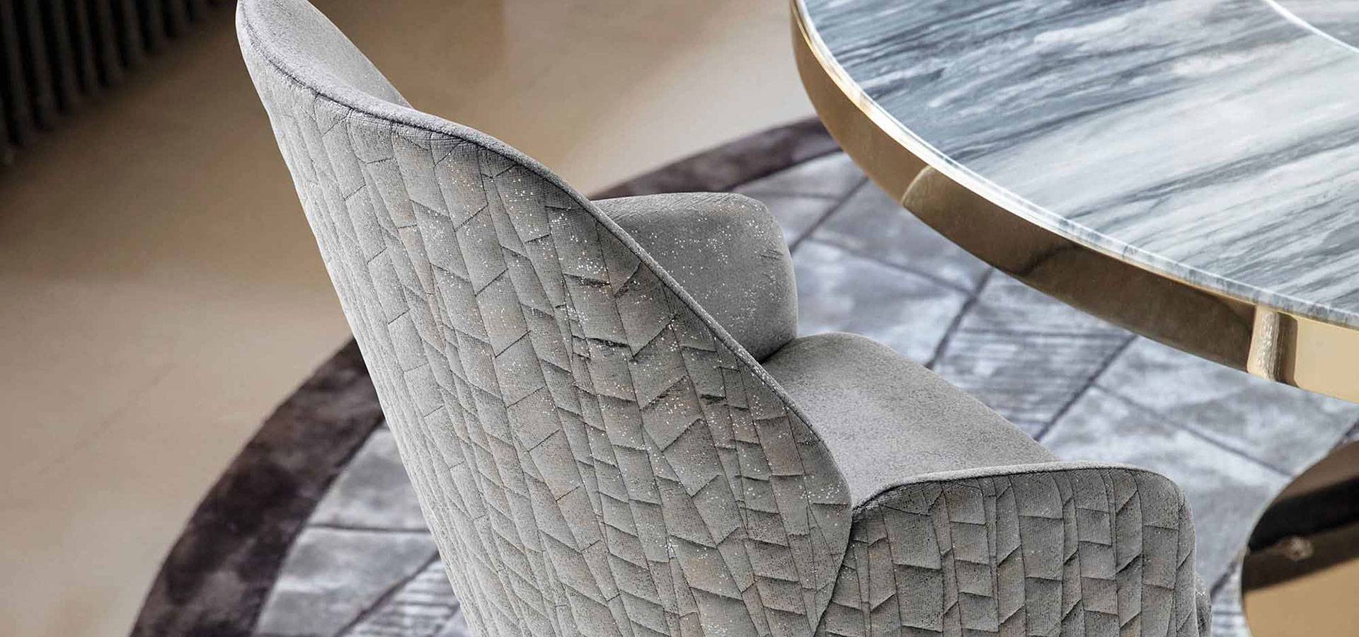 Solid beech side armchair with upholstering. 4 legs with gold chrome stainless steel embellishments. Giorgio Collection metal logo on a wooden base.