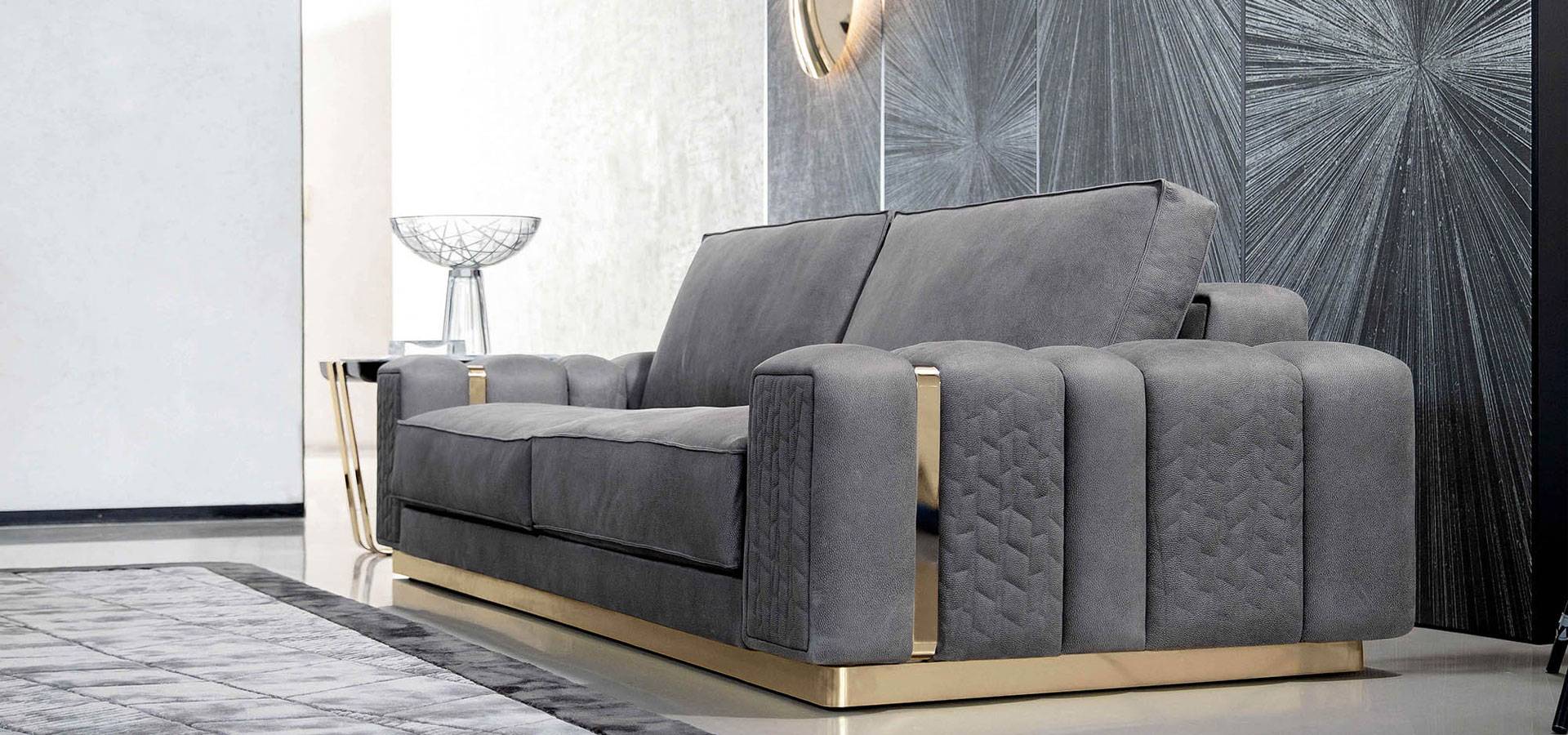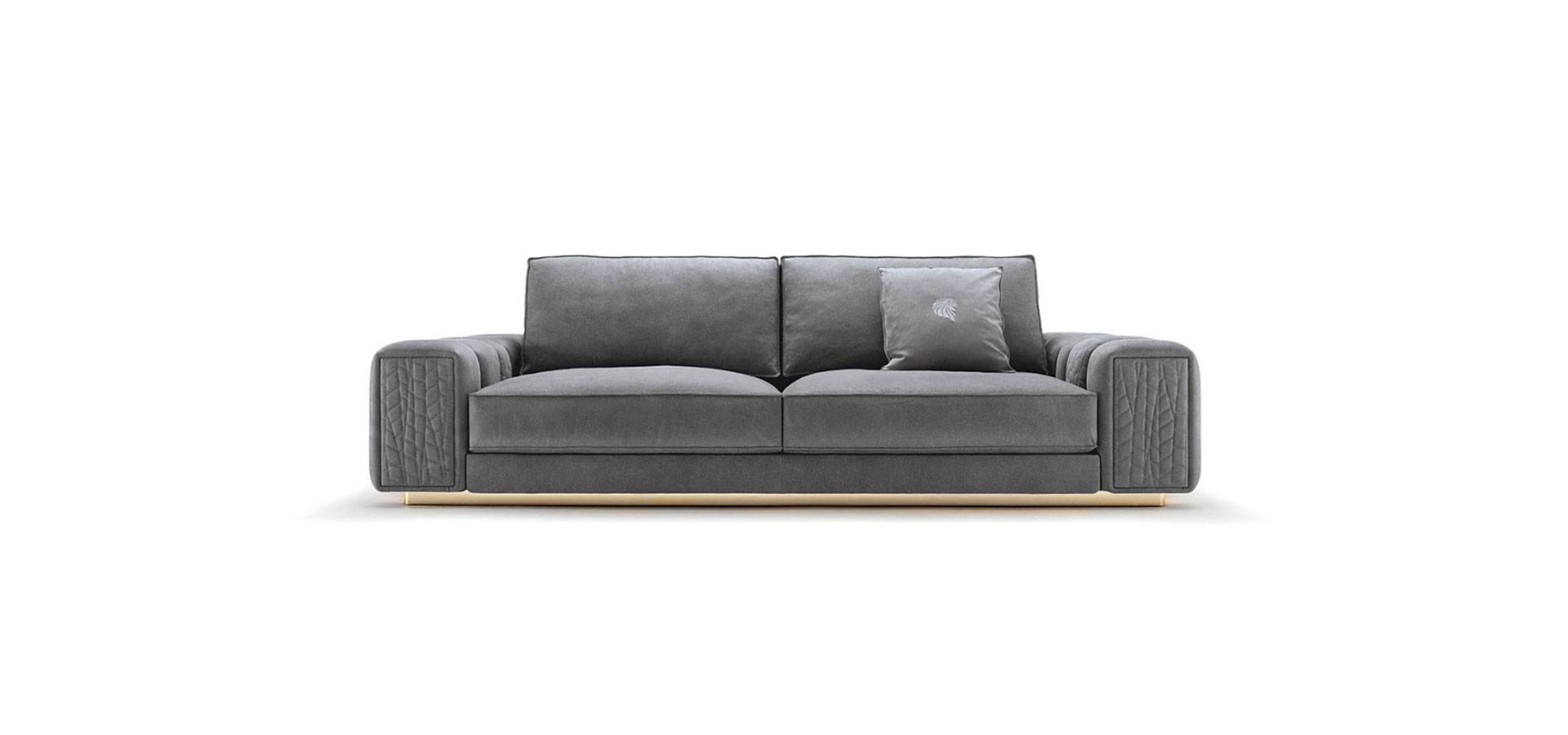 Special stitching in polyurethane foam wrapped in down feather on sofa seats and sides. Armrests for the sofa with a quilted finish. Stainless steel base and armrest metal trim in light gold chrome.