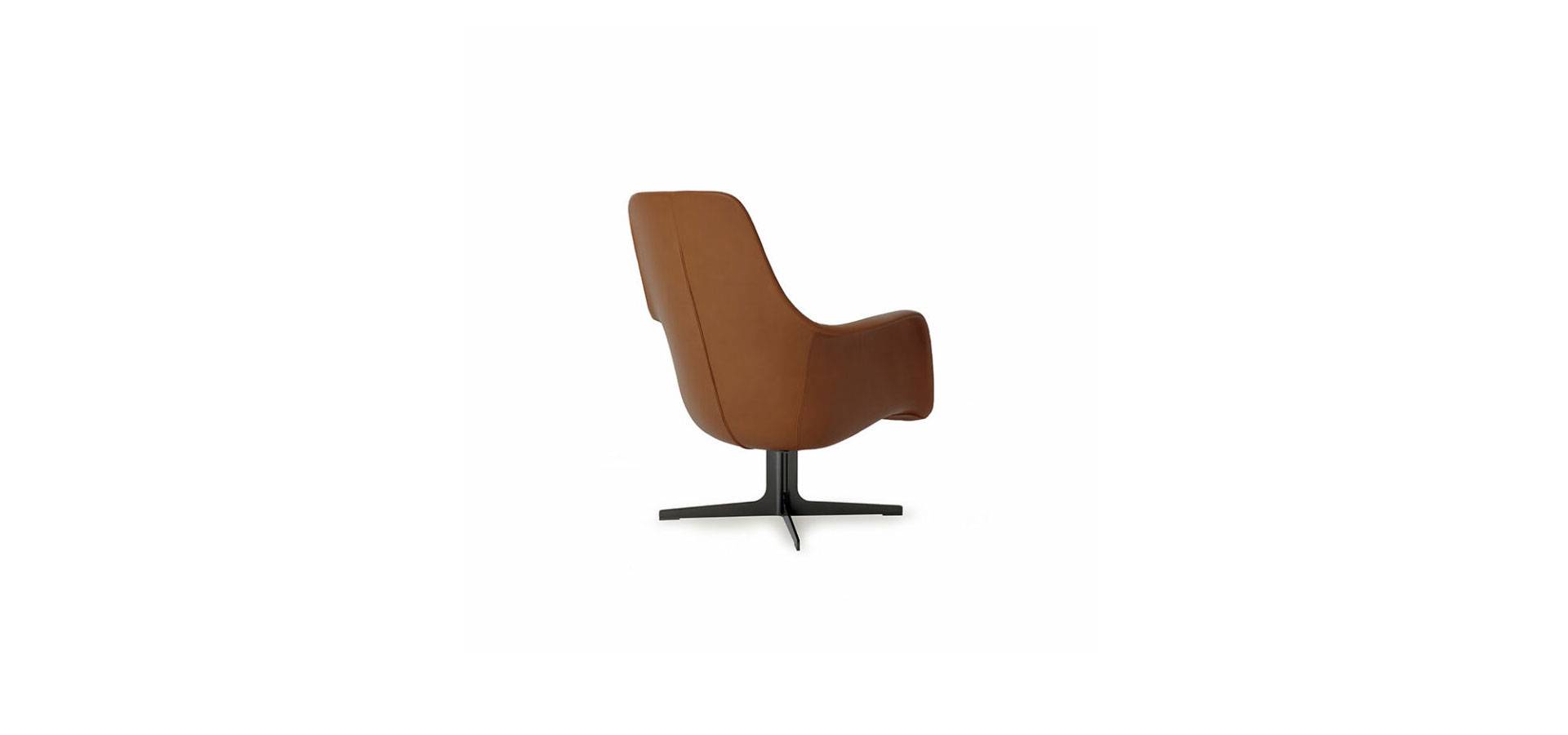 CipCip armchair is eclectic and humorous, with a characteristic curving form upholstered in fabric or leather and an Oval Logo embroidered on the back. Steel base with gunmetal grey or Silk varnish bronze finish.