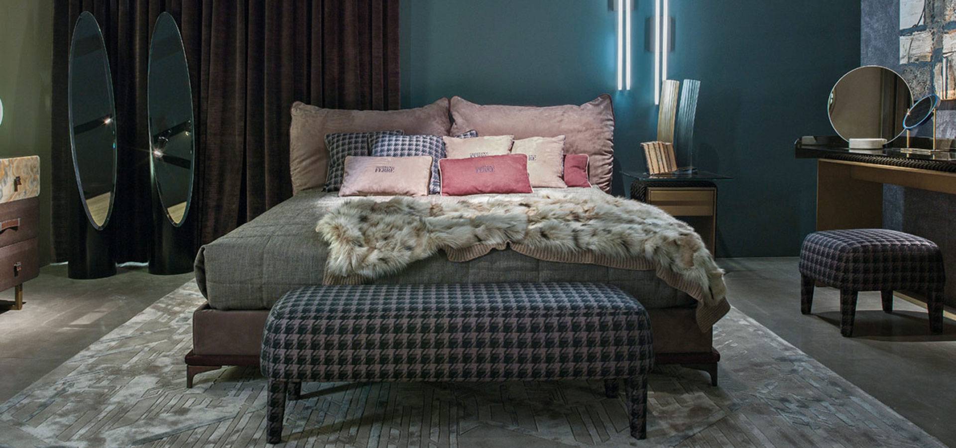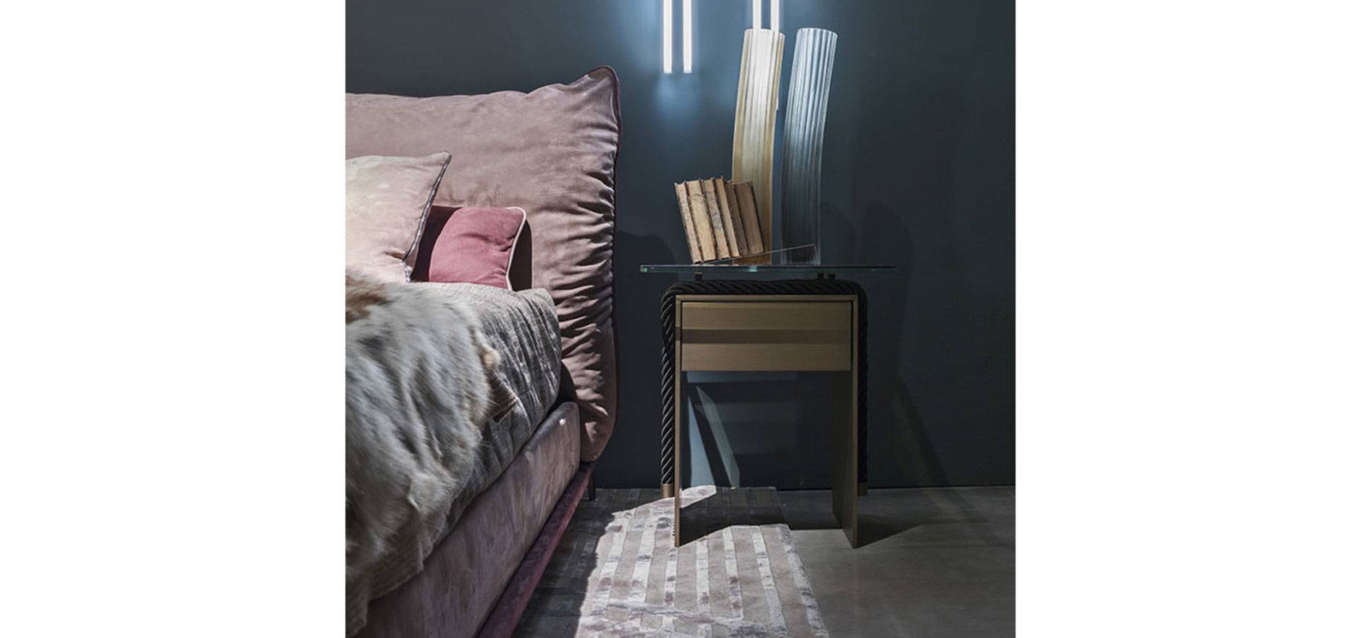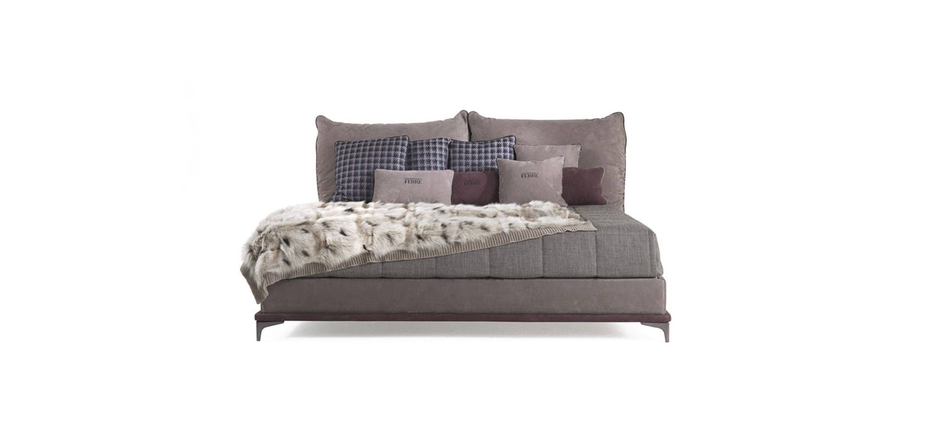The warm and inviting elegance of the leather lends the bed a reassuring and comfortable feel, which is accentuated by the presence of two large cushions, also in leather with contrasting piping, that serve as headboard. The new chrome-plated London smoke grey finish on the feet adds an urban touch to the overall look.