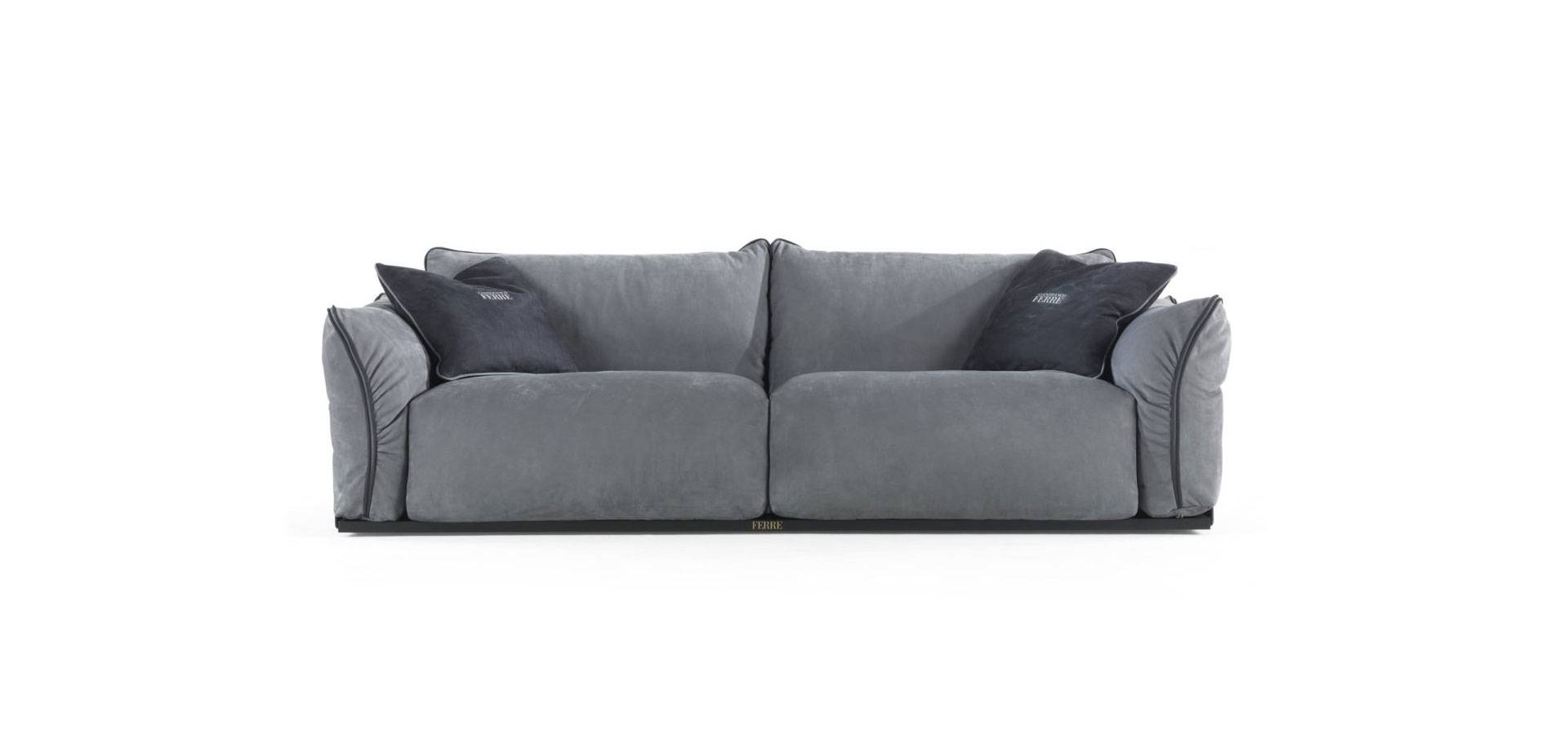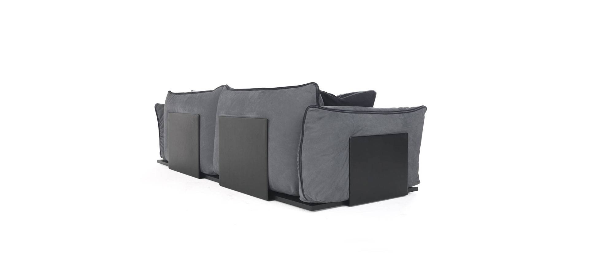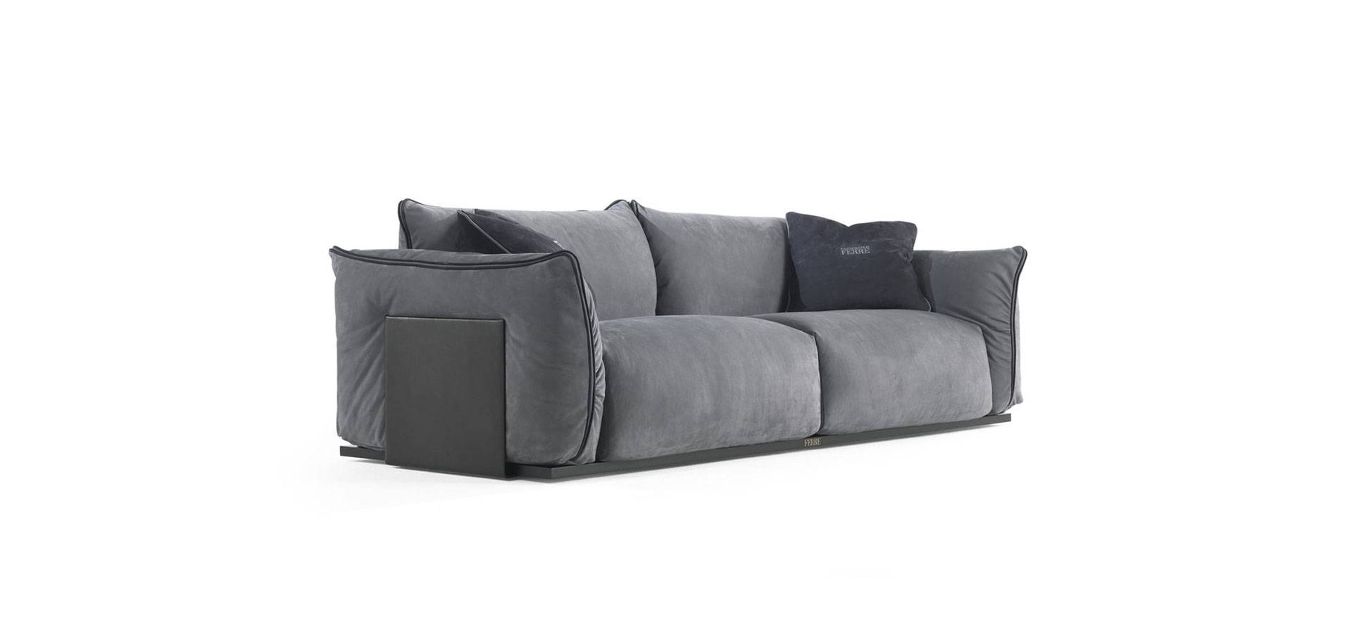 A stylish sofa with a comfortable seat and a modern design. The external metal plates upholstered in leather and the piping enhancing the profiles of the cushions emphasize the geometric volumes. The use of leather as a premium upholstery material gives the sofa a reassuring and comfortable feel, adding to its urban appeal.