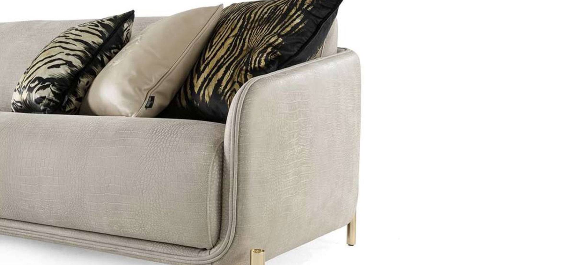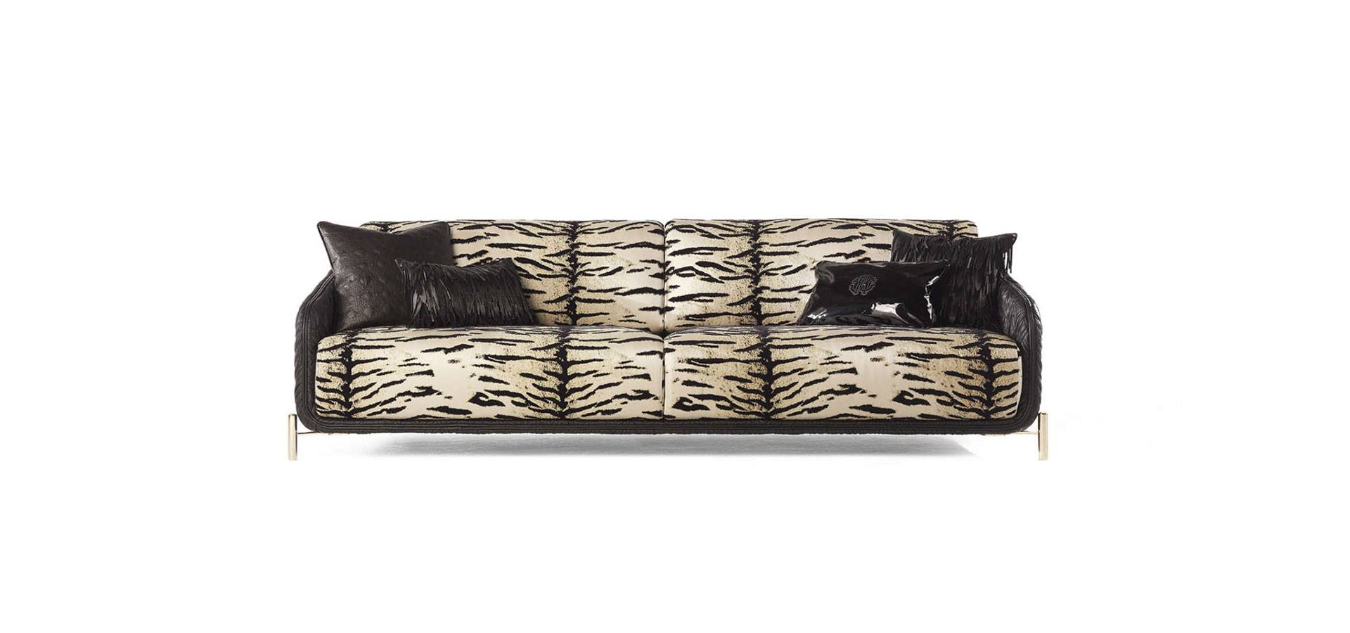 A one-of-a-kind, sensual sofa that perfectly expresses the brand's authentic spirit. The sofa is enhanced with animalier designs, which wink to Roberto Cavalli Home Interiors' most wild character. It is upholstered in a new textured and luscious Cocco leather.