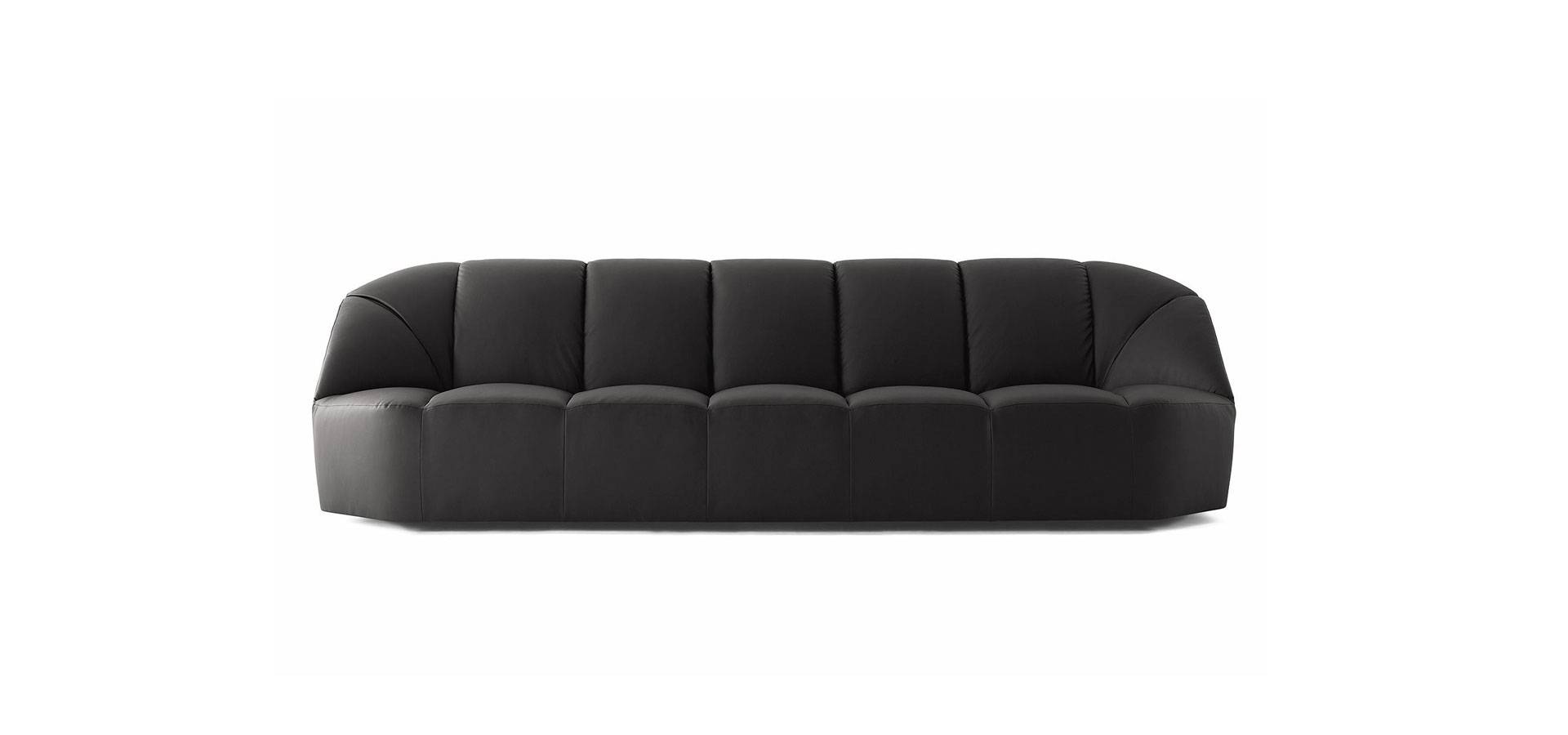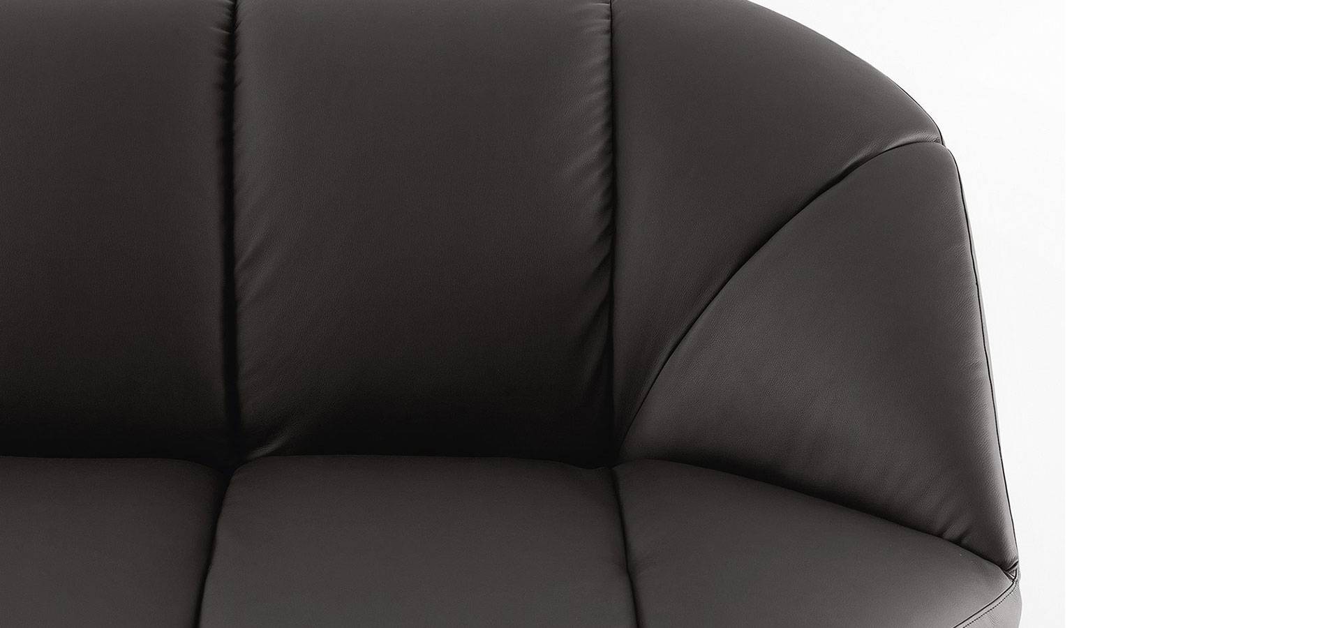 Sofa with internal structure made of wood and by-products and non-deformable polyurethane foam of various densities and polyester fiber. MDF mass base in black. There are two polyester fiber back cushions. Upholstery in the samples' hues is available in fabric or leather. On request, polyester fiber decorative cushions are available. Fabric cover can be removed if desired.