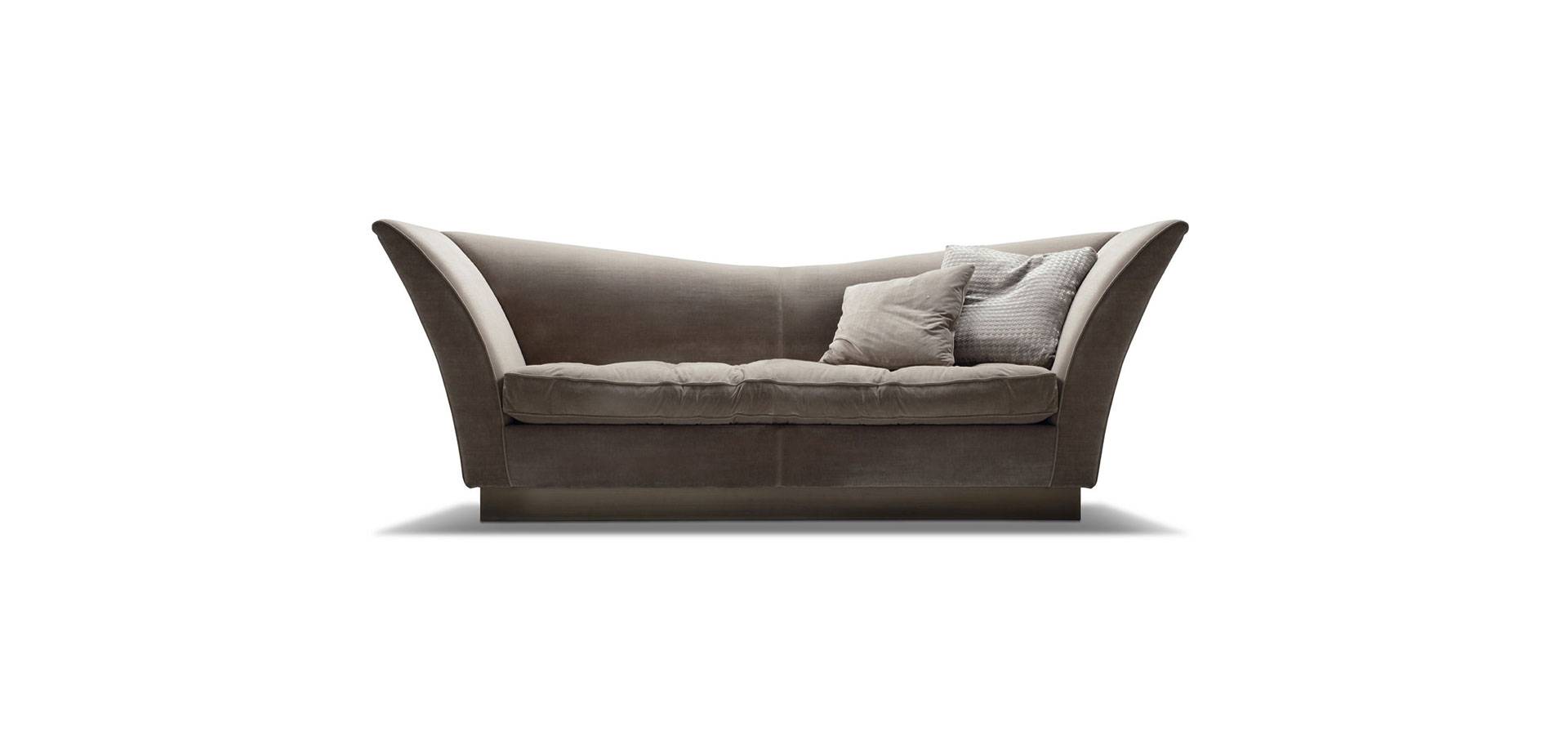 There are two seats and two throw pillows on this fixed sofa. Base is bronzed stainless steel.