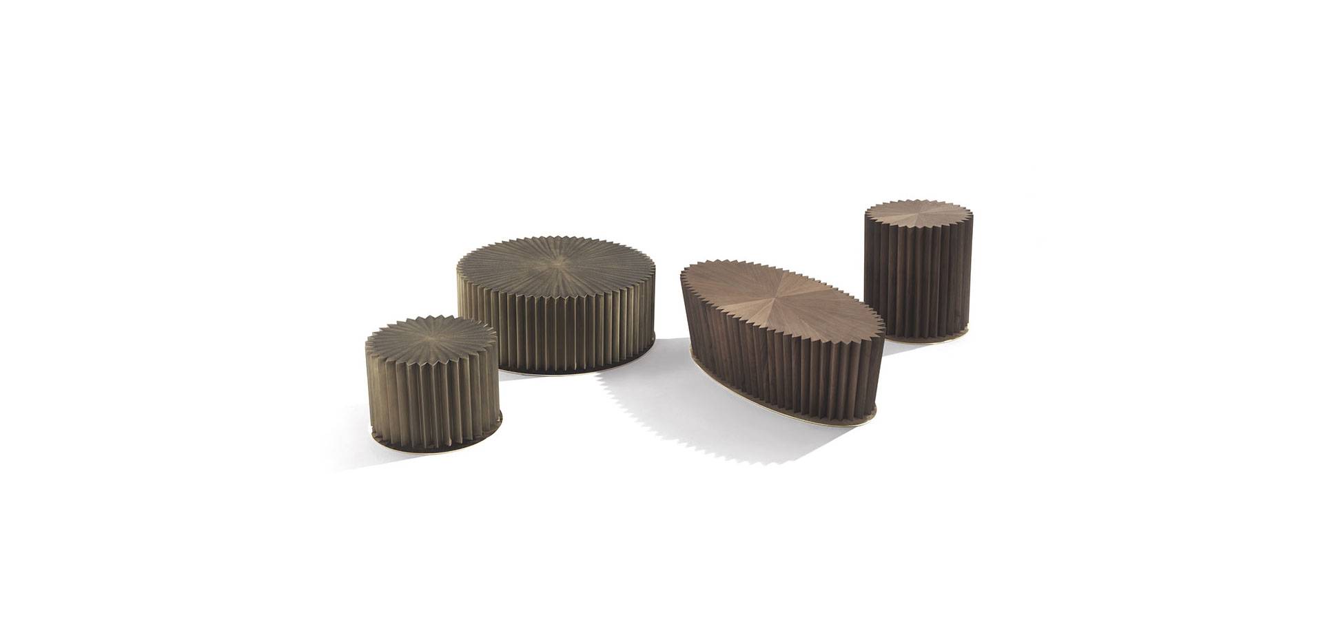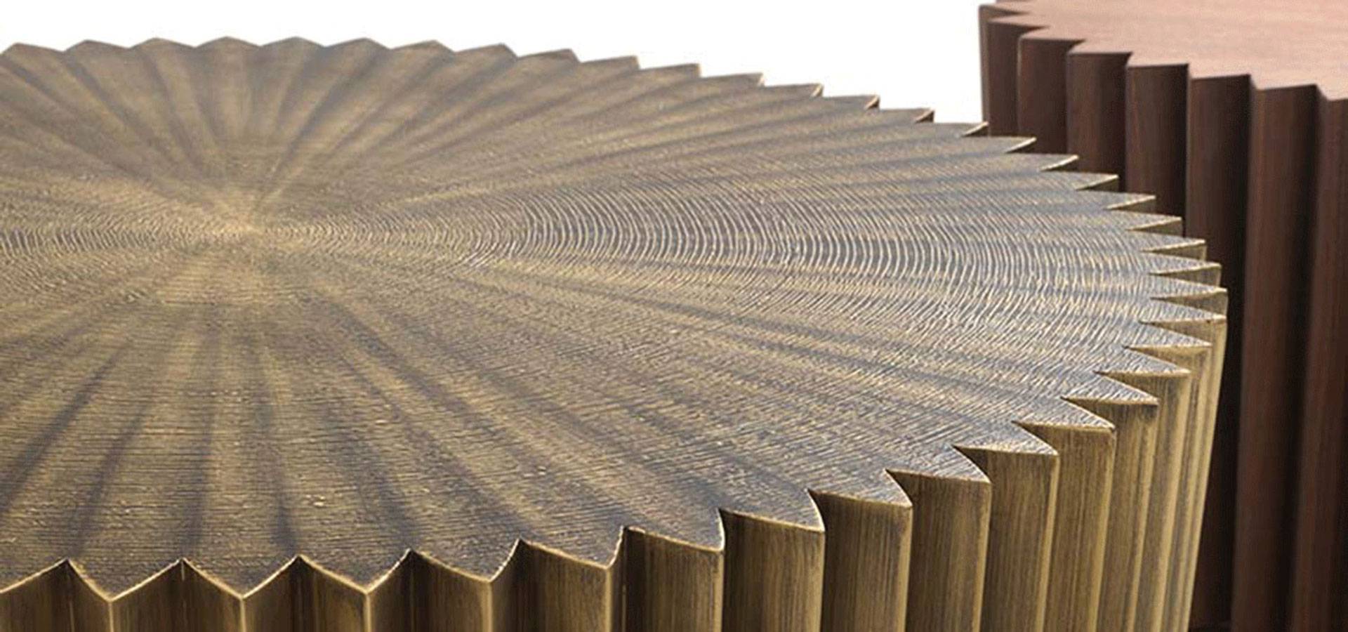The circle's perfection in perimeter geometry is established by the processing of numerous acute angles to produce a starry effect. Except for the detail of the metal base on which the timber structure sits, the Colonna coffee table is a utilitarian, monolithic, and minimalist object. Every room needs a passe-partout.