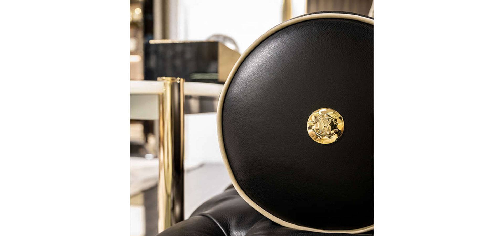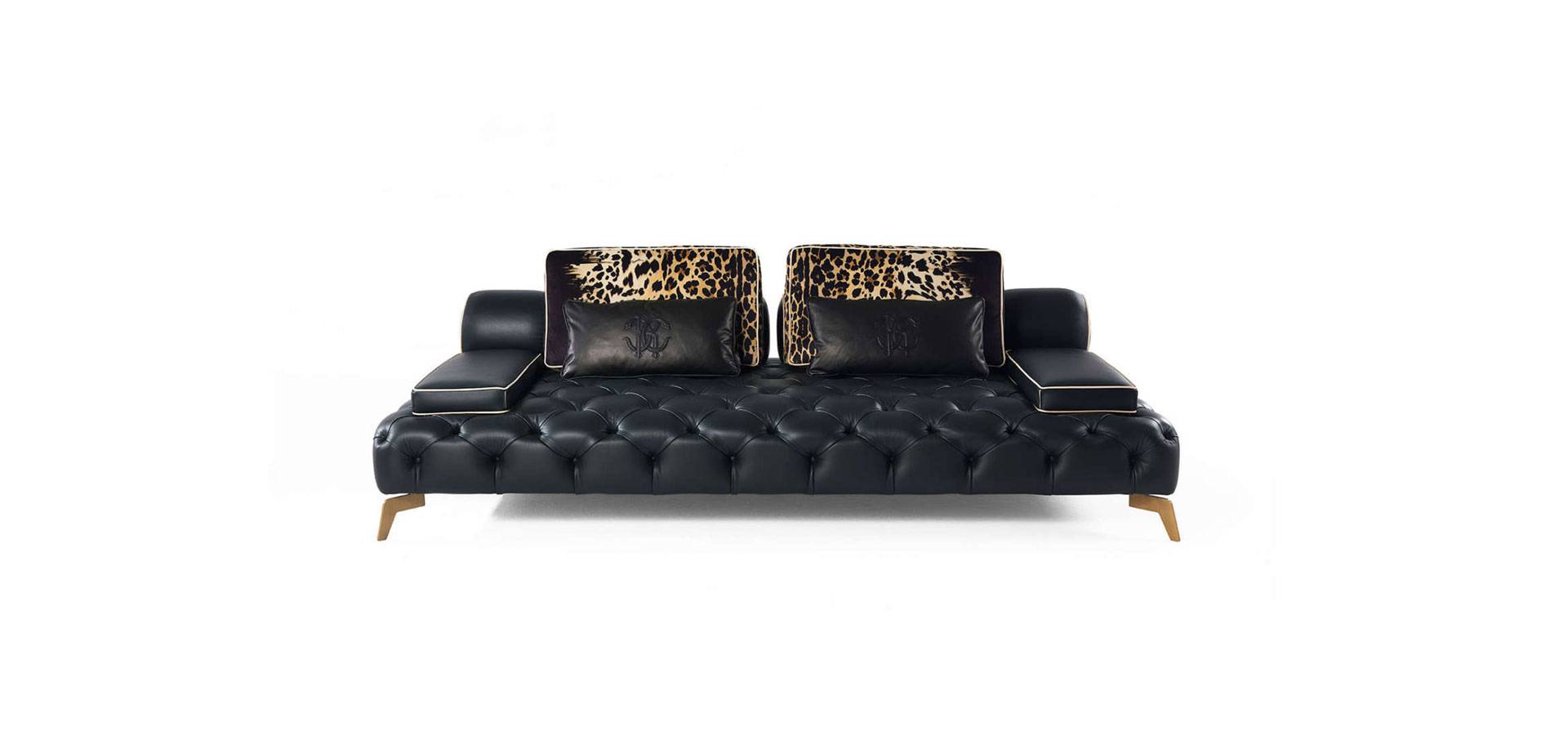 The Darlington sofa, a classic from the Roberto Cavalli Home Interiors collection, has a sophisticated capitonné finish. In the new design, the sofa has sand leather upholstery and cream nubuck piping. Wild Tiger-patterned and snake-embroidered leather cushions complete the look.