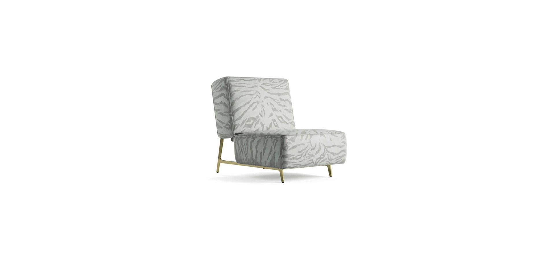 Davis is the protagonist of exclusive nooks dedicated to leisure and personal conversations, thanks to its beautiful lines and small proportions. The armchair is refined and elegant, upholstered in the trademark Wild Tiger fabric in a delicate beige tone and lifted from the ground by slender golden legs that give the whole a light and luminous look.