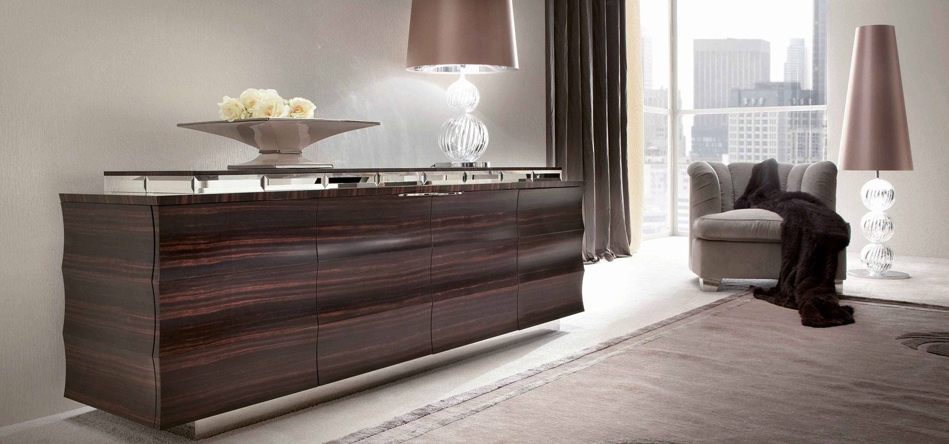 4 door buffet with satin finish makassar ebony veneer. The two center doors have a led light system with sensors. Top features beveled mirror inserts on the borders and a chrome stainless steel top inlay.