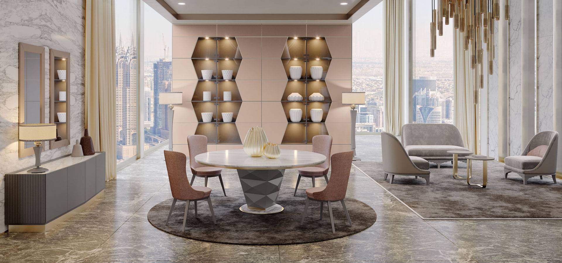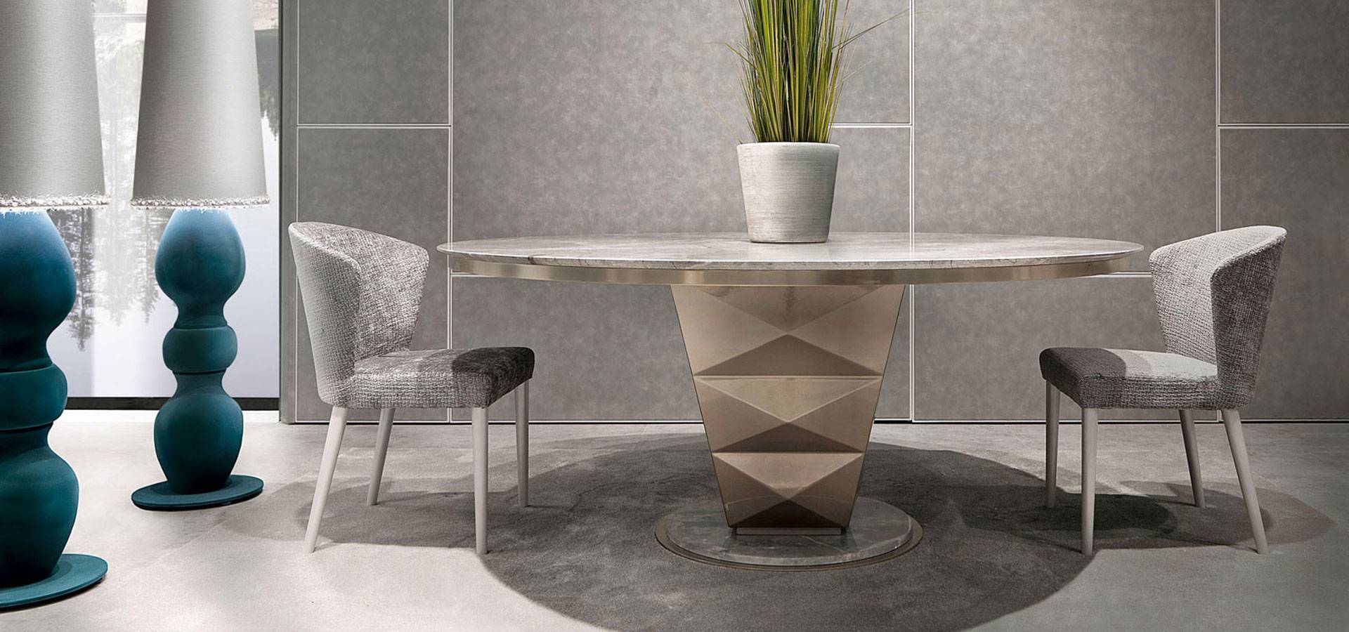 Erik is a colossal dining table with a polished and understated elegance. The sturdy middle leg is made of wood with a diamond-shaped surface and comes in a wide range of finishes to match the metal-framed circular tops. Tops come in a variety of finishes, including lacquered wood, exquisite marble, and mirror surfaces. Erik is the ideal table for major dining rooms, thanks to its marble platform and metal design.