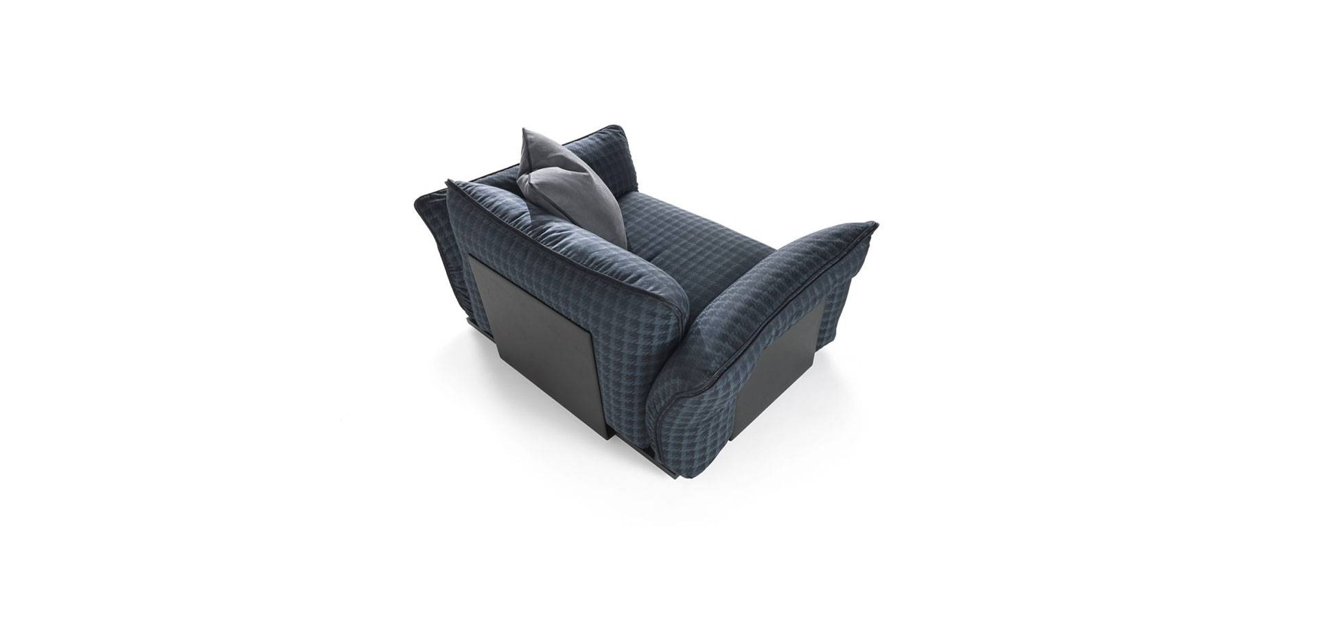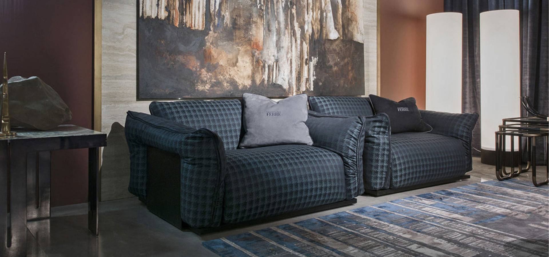 An appealing armchair with a comfortable seat and a modern design. The external plates in metal upholstered in leather, as well as the piping in the same material, emphasize the geometric volumes. The upholstery in fabrics inspired by men's fashion, such as houndstooth, or in leather, adds to the sofa's urban charm, bringing it in line with Gianfranco Ferré Home's identity.