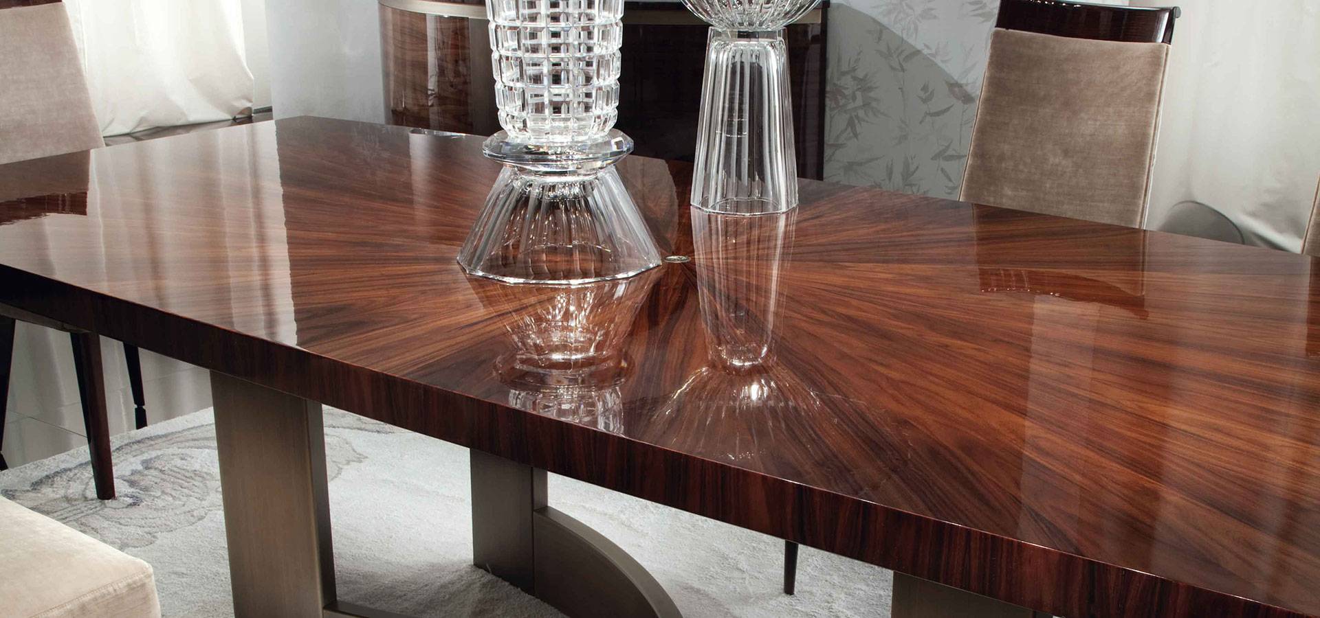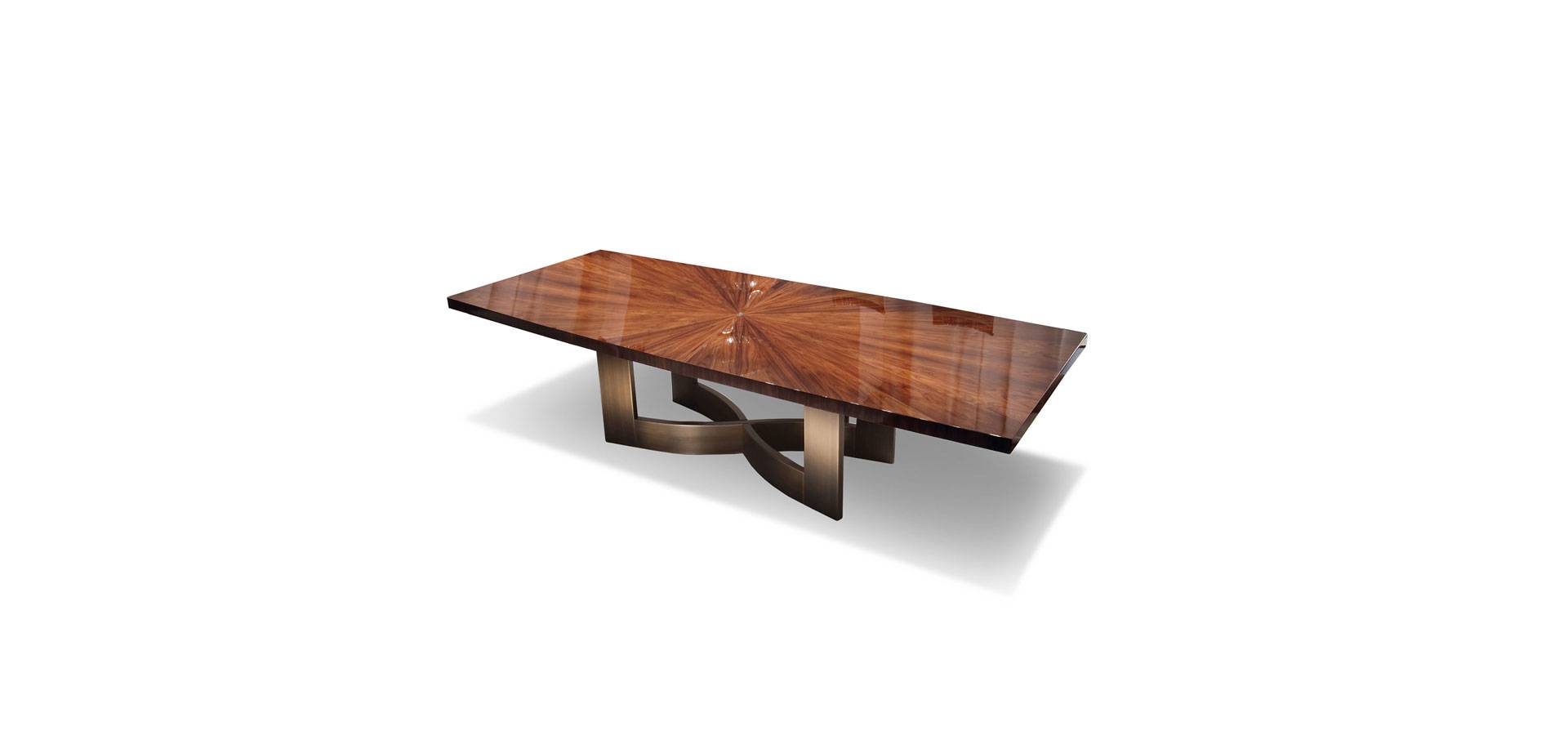 Rectangular table with a high gloss polyester finish and a veneer of Brazilian rosewood. Bronzed stainless steel fixed top and base Top with sunburst veneer.