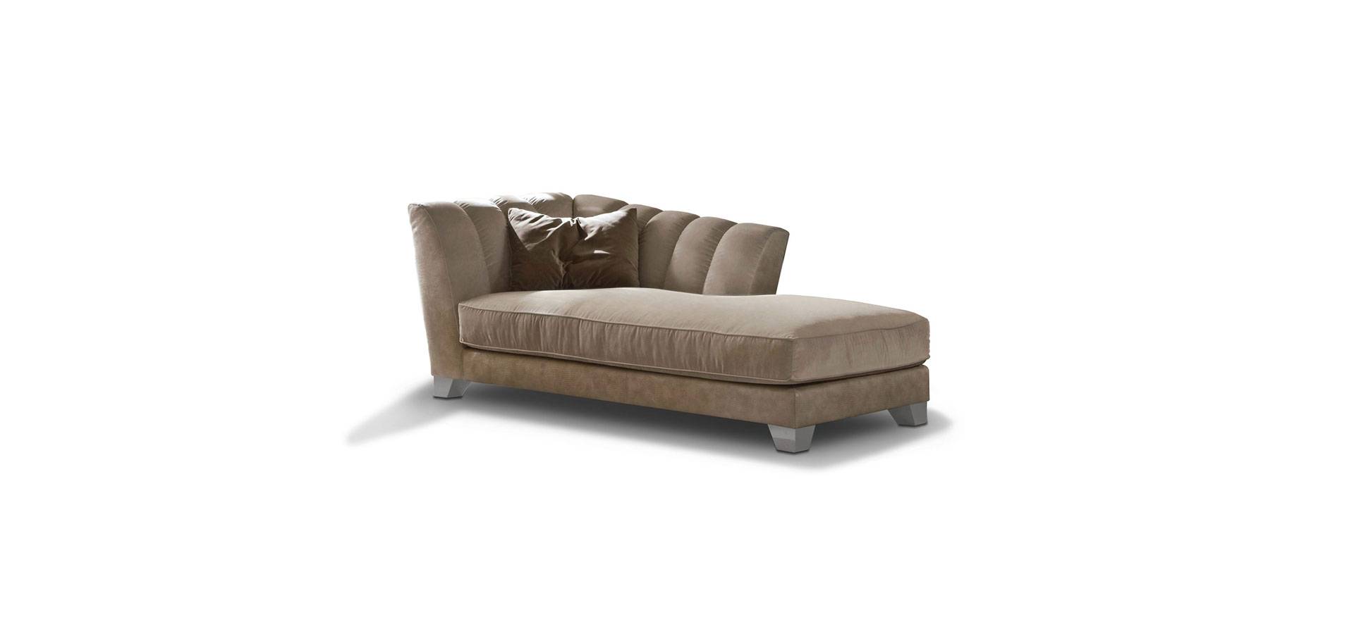 Right or left facing chaise longue with iguana patterned leather and velvet. Down-wrapped polyurethane foam seat. stainless steel feet in chrome