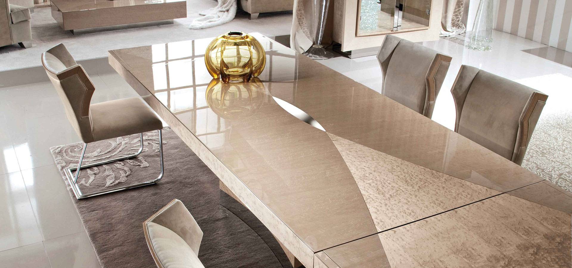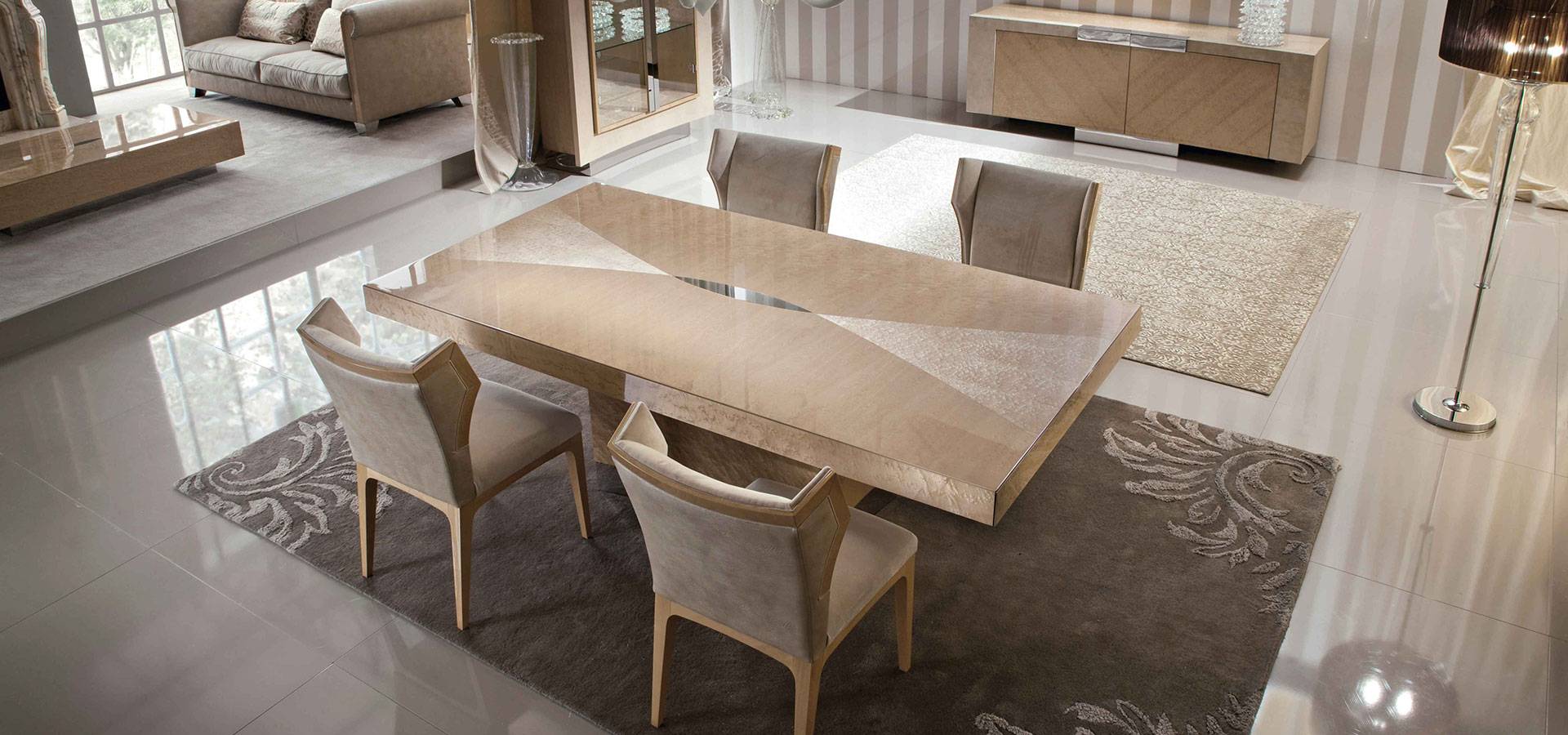 Champagne bird's eye maple veneer rectangle table with high gloss polyester finish. Chrome stainless steel base.