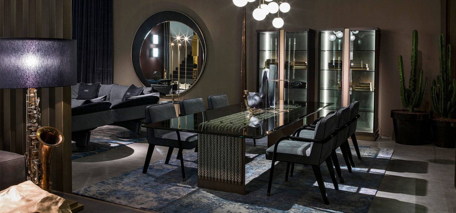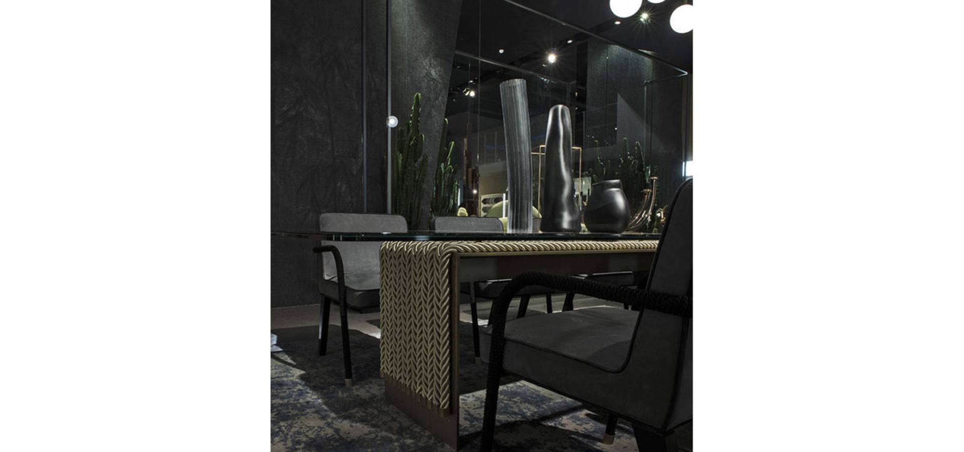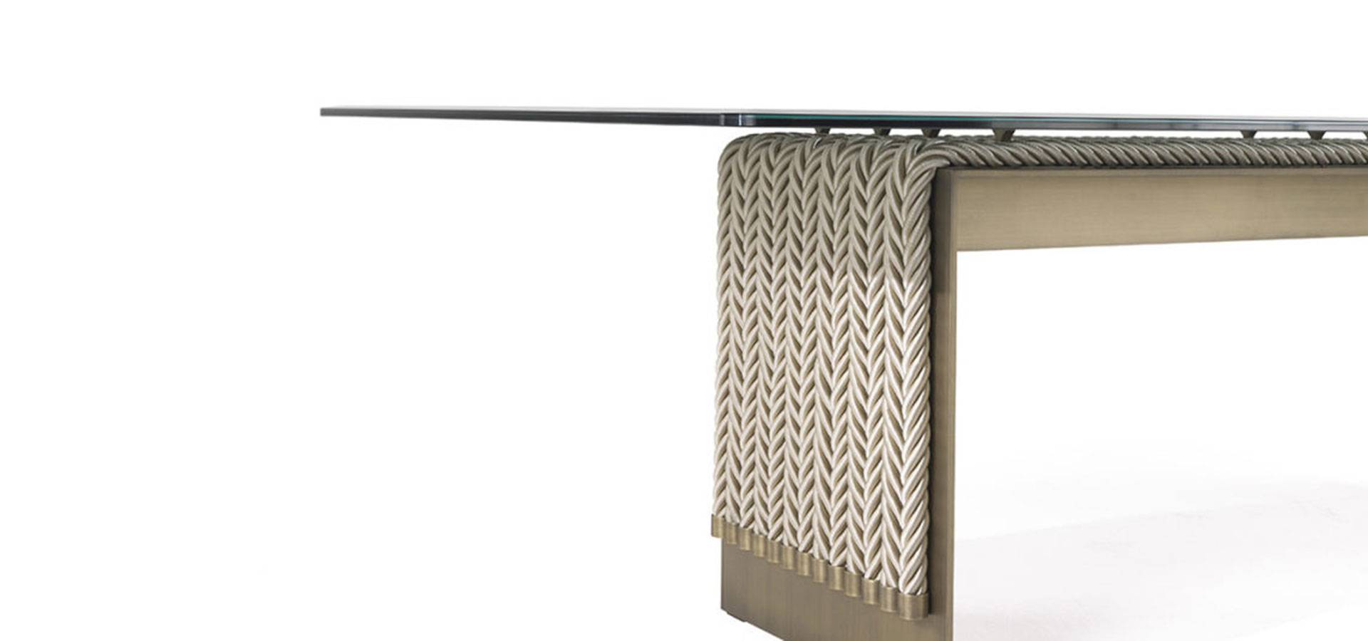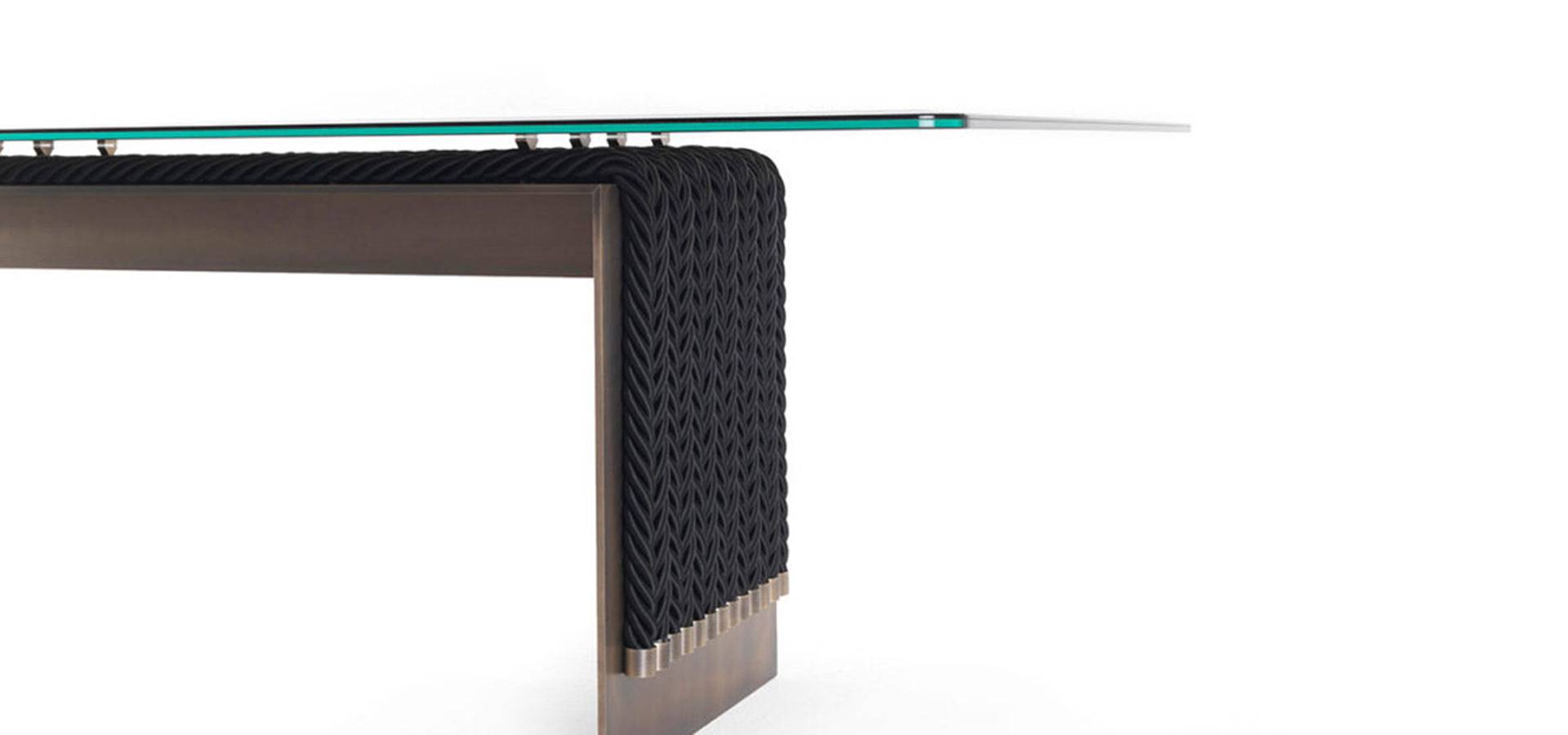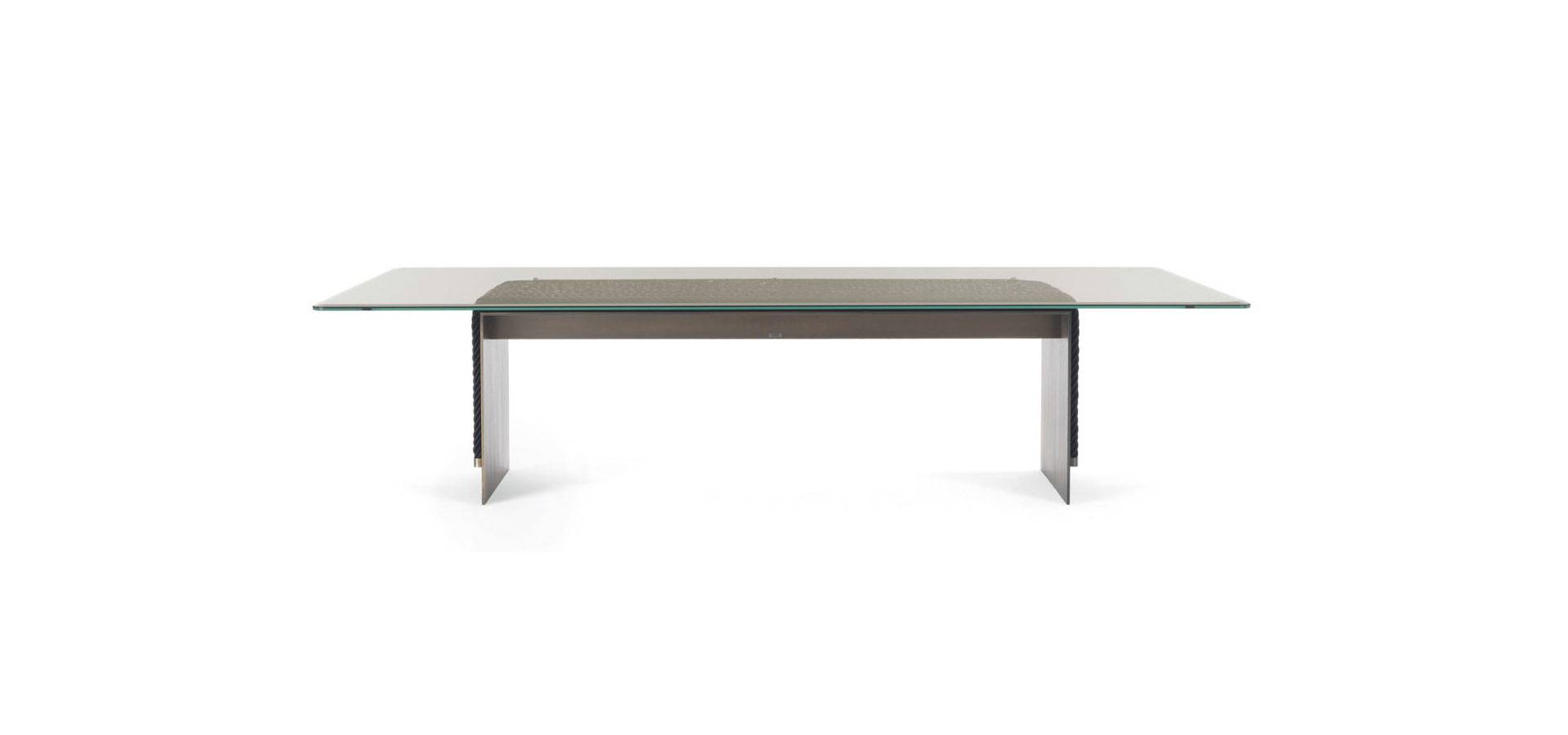 The dining table is an evolution of the Glasgow line, which was first shown at the Salone del Mobile in 2018. It combines the linearity of the design with the complexity of the craftsmanship. It features a top in coupled glass bronzed glass and a metal structure with a bronze finish, as well as decorative strings.