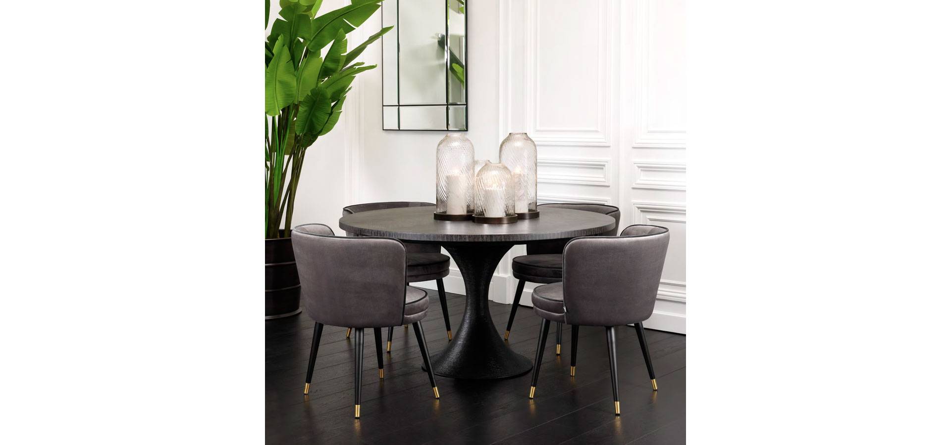 With the lovely Grenada Dining Chair, you'll be right on trend. This stunning retro chair has a swivel seat and black tapered legs with brass caps. The seat and backrest are upholstered in Lyssa off-white fabric with greige velvet piping. This dining chair exudes a Mid-Century Modern vibe and will add vintage charm to your dining room or kitchen.