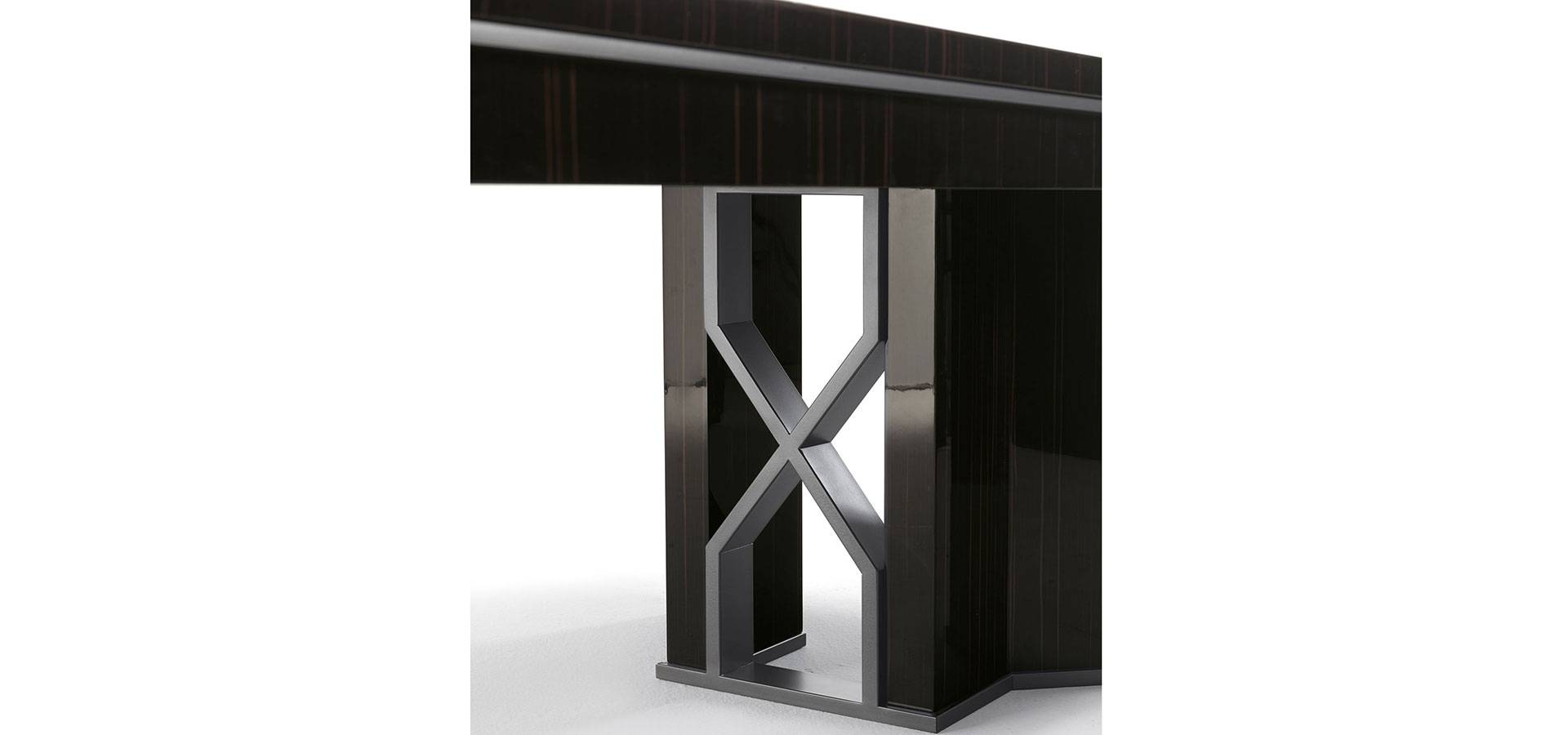The Grimaldi table set, which comes in round and rectangular varieties, emphasizes the contrast between the wood of the structure and the metal elements in the top thickness and legs. The metal detail that forms a particular pattern, such as a fil rouge that runs along the table and is replicated in the leg with a cross-line design, is highlighted on the top. In its strict lines, this table is substantial and austere.