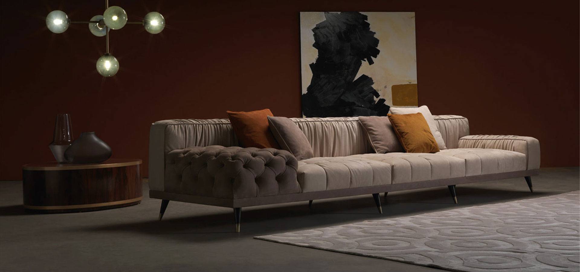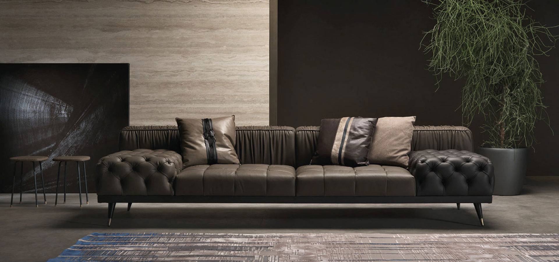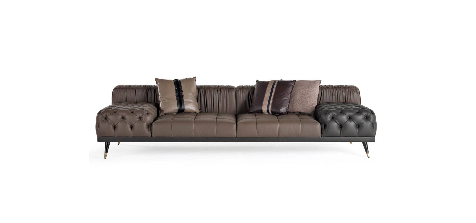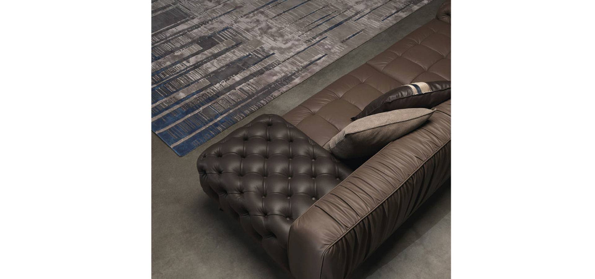 A sofa with a bold personality that combines essential design, contemporary lines and a high level of craftsmanship. The alternation between different finishes, with capitonné parts and pleating on the back creates a unique and refined set that expresses the sartorial skills of the brand.