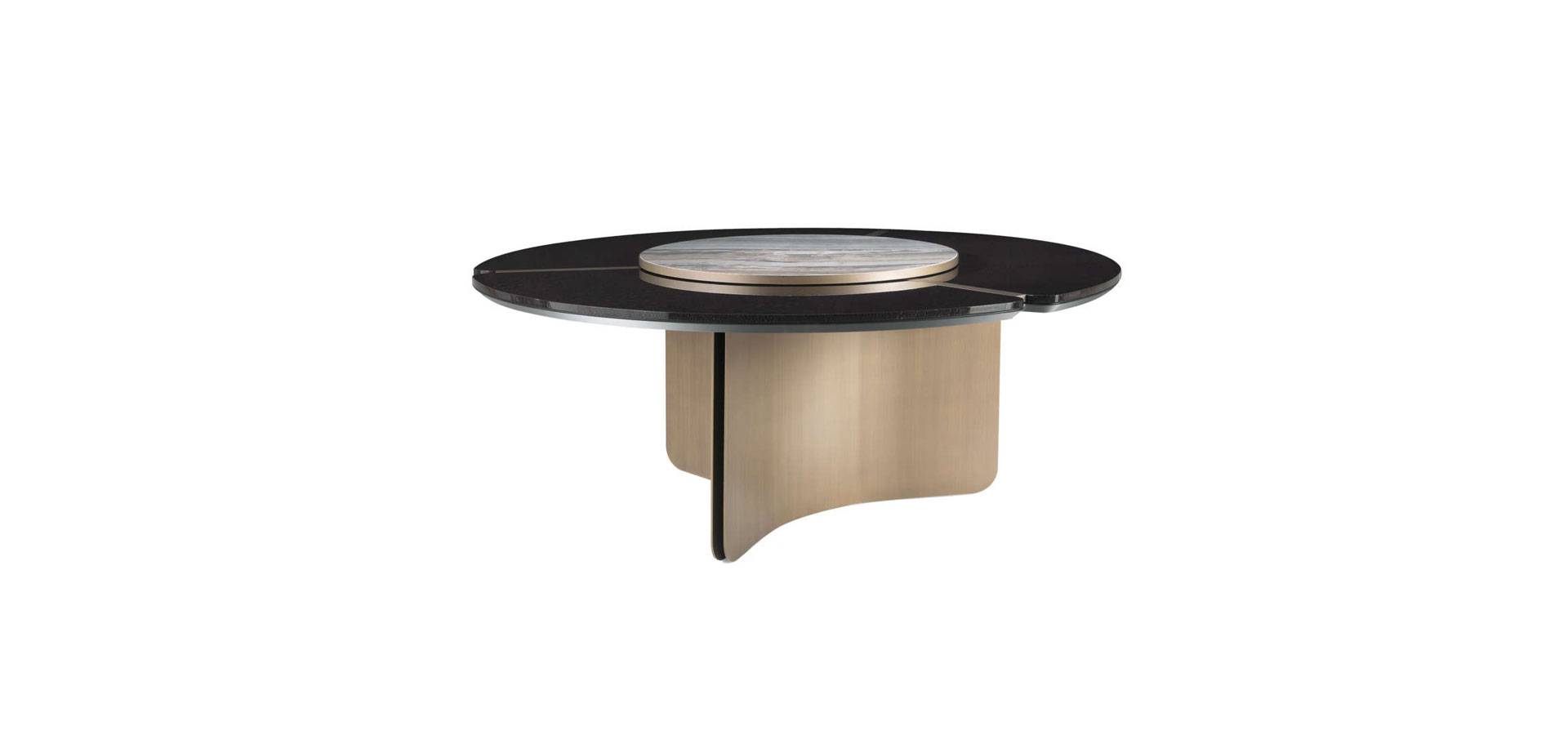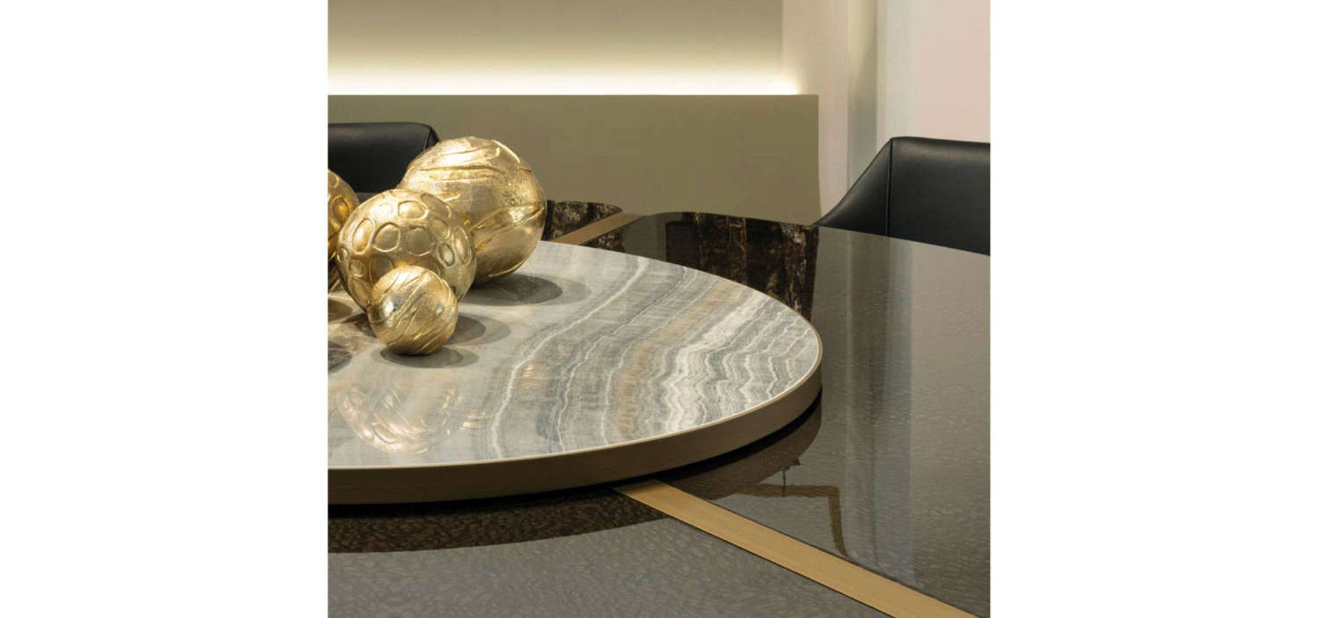 Kibo is a sculptural table with a lot of personality that blurs the line between art and design. It's a table with a lot of visual impact. The table is a complicated composition and an expression of great craftsmanship. A grey Carbalho essence gloss surface is coupled with a Grey Porcelain Gres Lazy Susan: a combination of materials and colours that brings refined light and reflections to life.