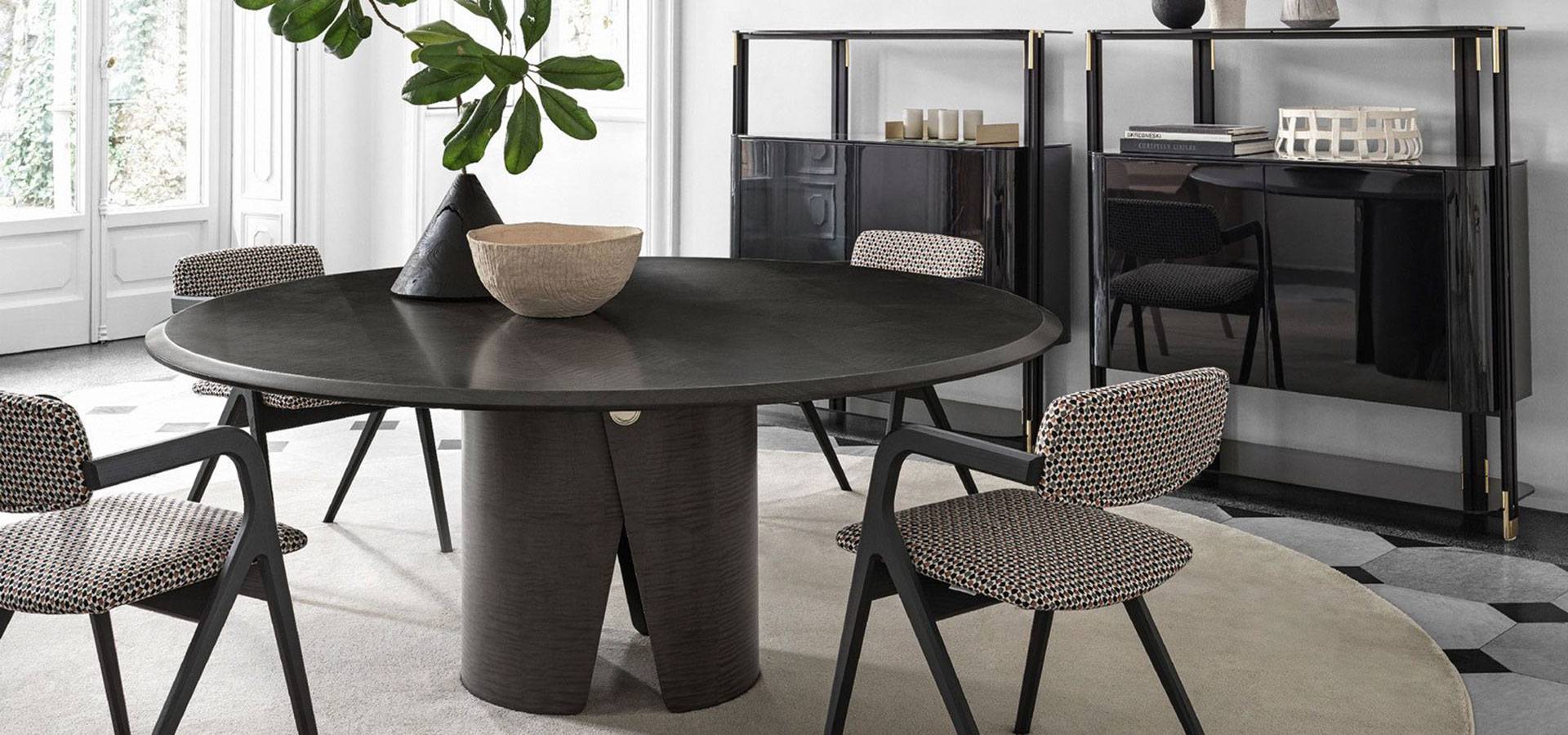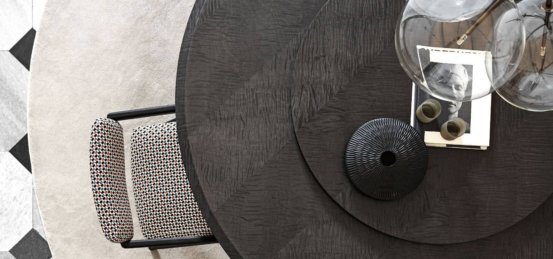 Tabletop with Frisè Walnut herringbone wood inlay and black bevelled edge in "Colore." Frisè Walnut, dark grey Frisé Maple, or white Frisè Tanganika with bevelled edge in the same finish are also available. Satin brass button on curved base. On request, a resting lazy susan is offered in the same finishes as the tabletop.