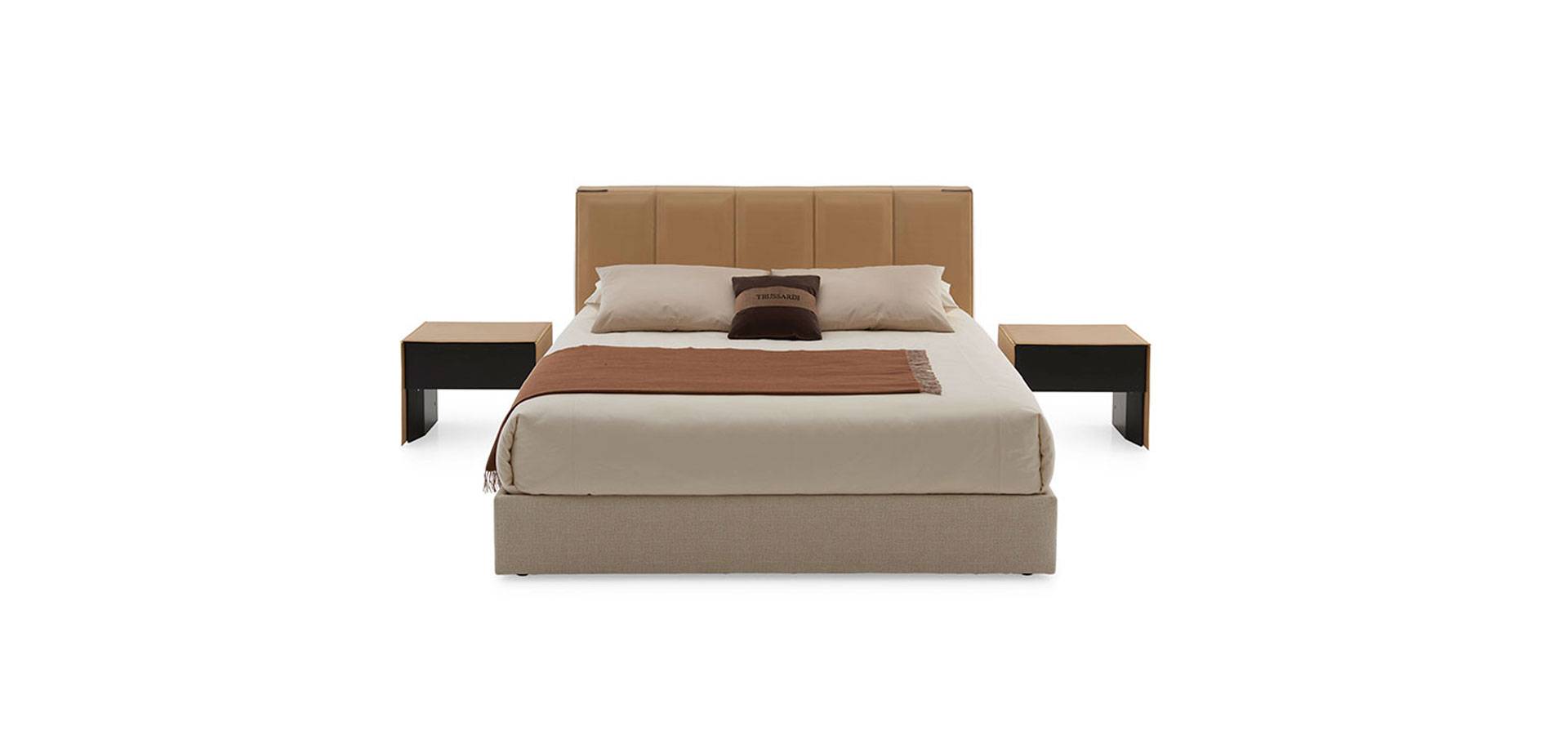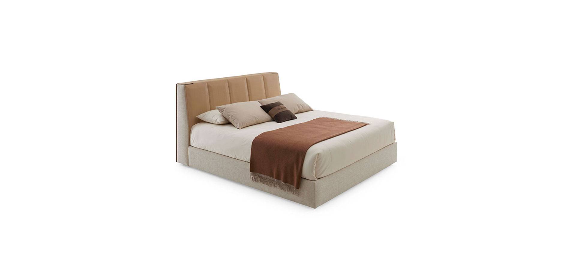Marris is the bed that completes the seat lines that bear his name. Its form is elegant and reasonable, defined by a leather element made with enormous vertical lozenges that entirely envelops the surface of the huge headboard with squared outlines. Fabric or leather covers the headboard's lateral edges and base. Steel accents in gunmetal grey or polished brass finish.