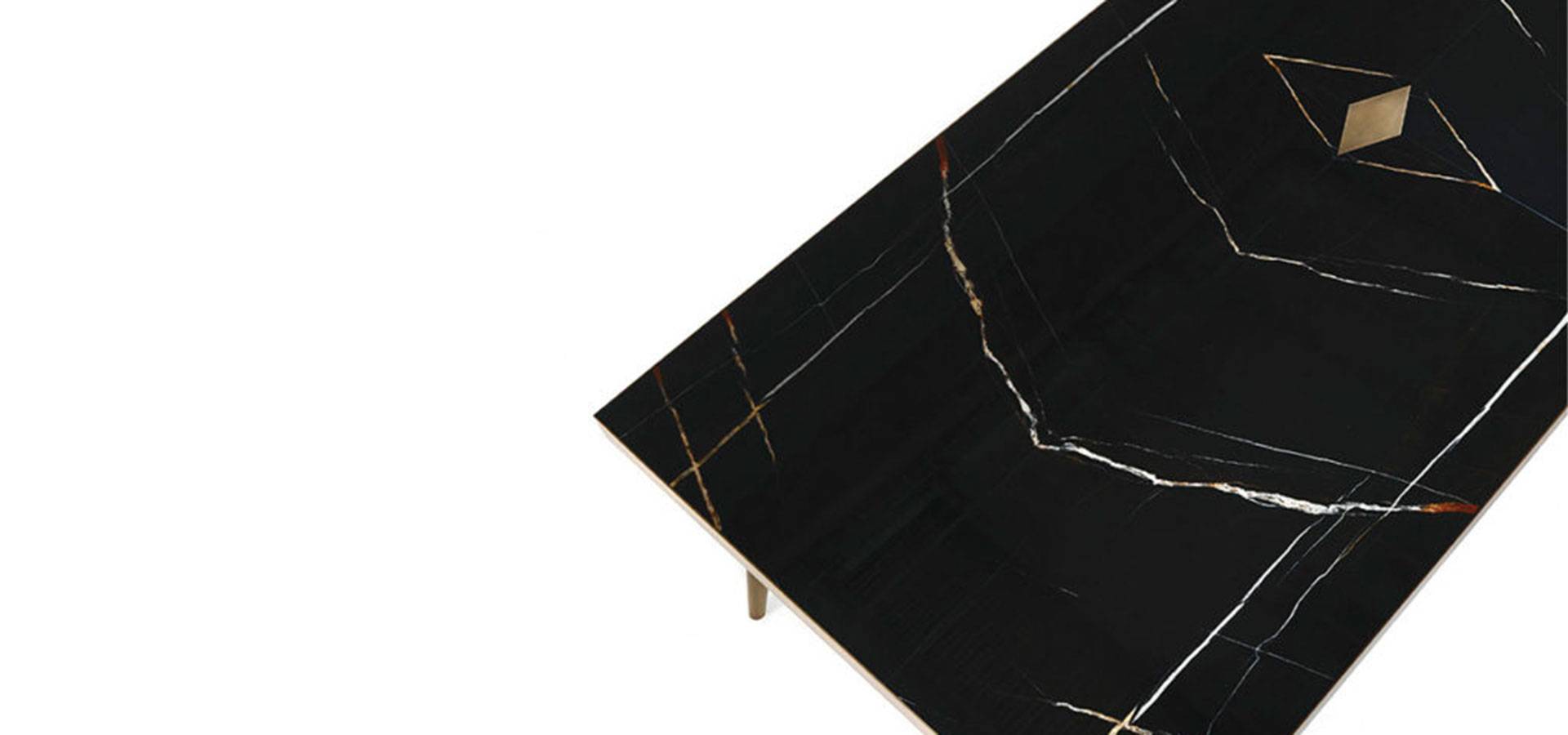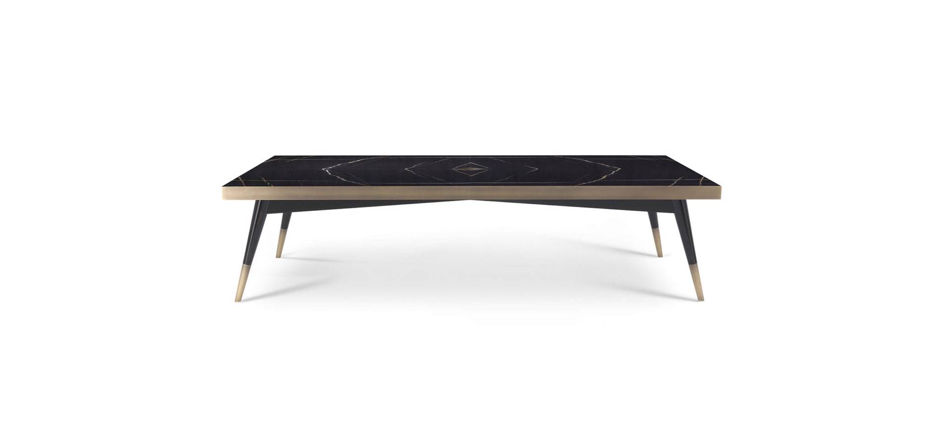 A rectangular version of the Mayfair dining table was introduced this year. The top is made of precious Sahara Noir marble and features a central brass rhombus from which the mirrored marbles are divided. The slim legs, with a black lacquered finish and bronzed brass details, harken back to the 1950s and lend an air of elegance and lightness to the table.