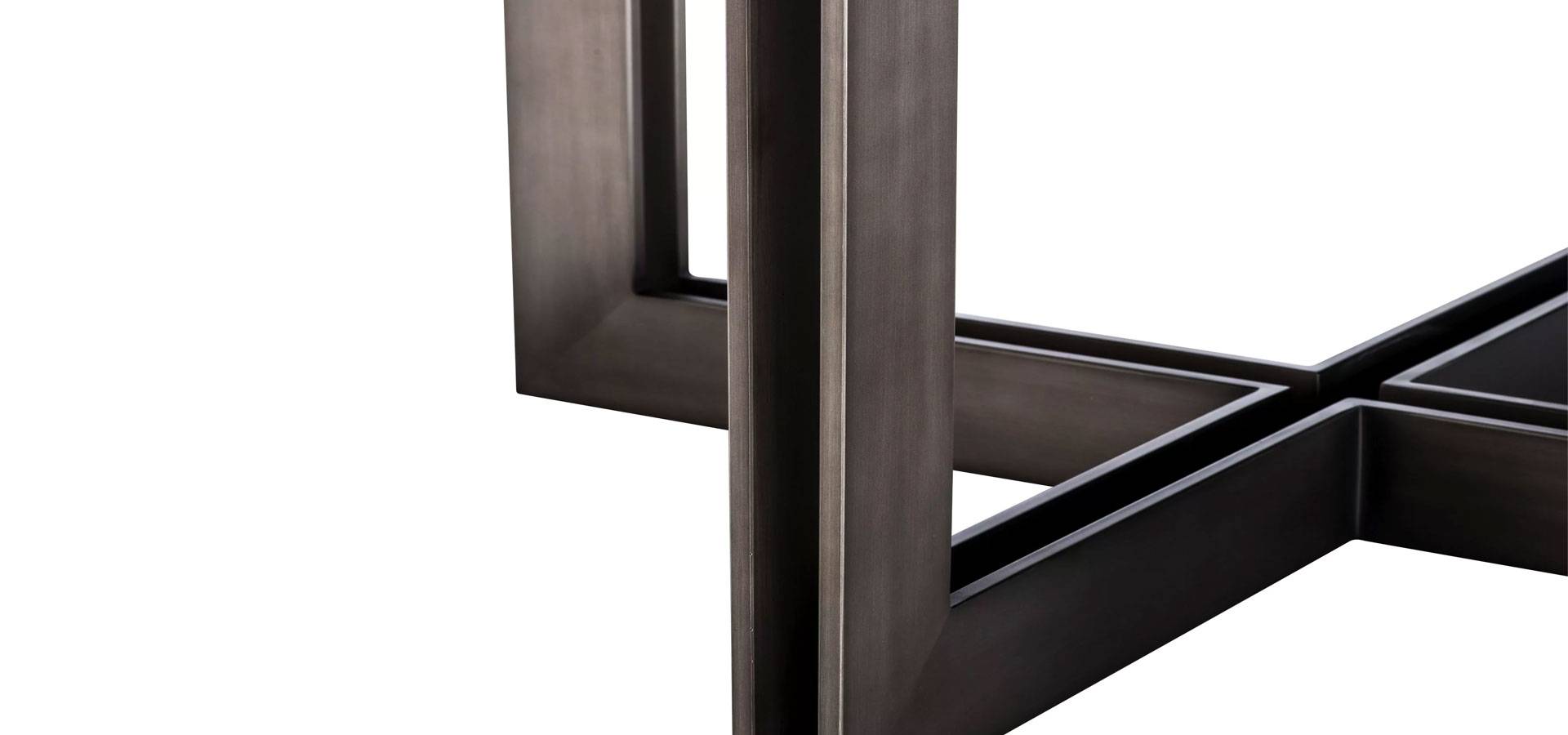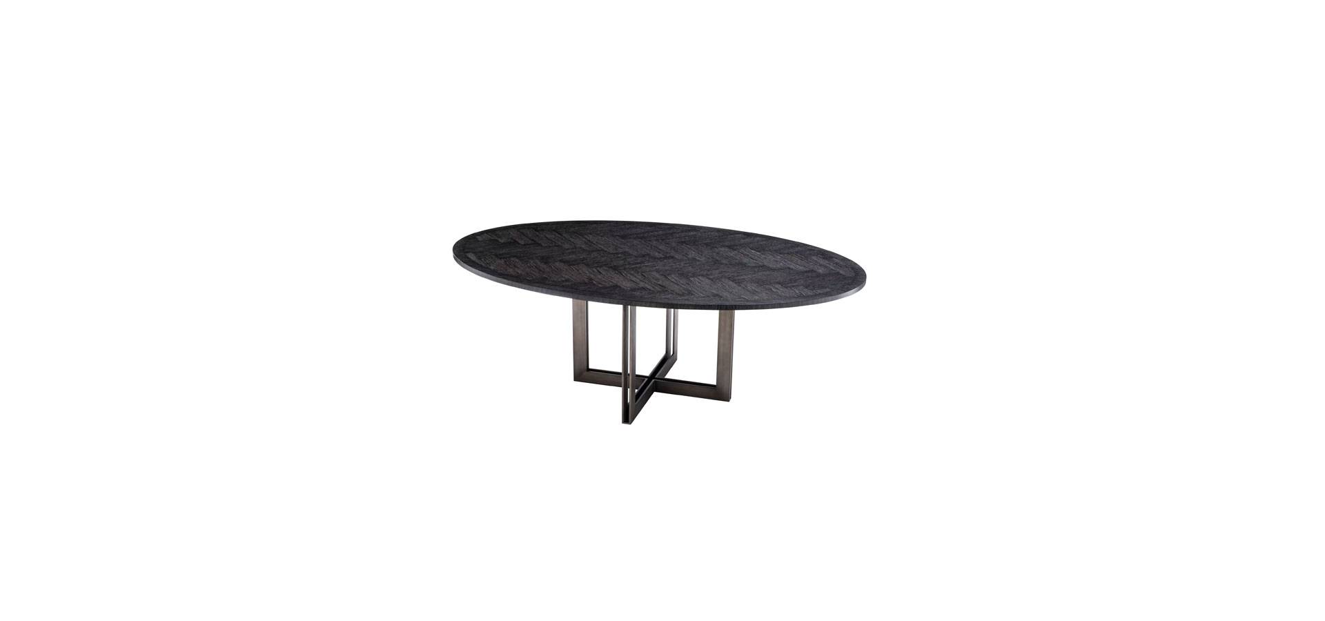 The stunning charcoal oak veneered Melchior Dining Table, with a sturdy base in a bronze finish, will add Mid-Century Modern appeal to your décor. Veneers are ideal for marquetry, as evidenced by the lovely herringbone pattern on this oval dining table. High-quality veneer outlasts solid wood, which warps and cracks over time.