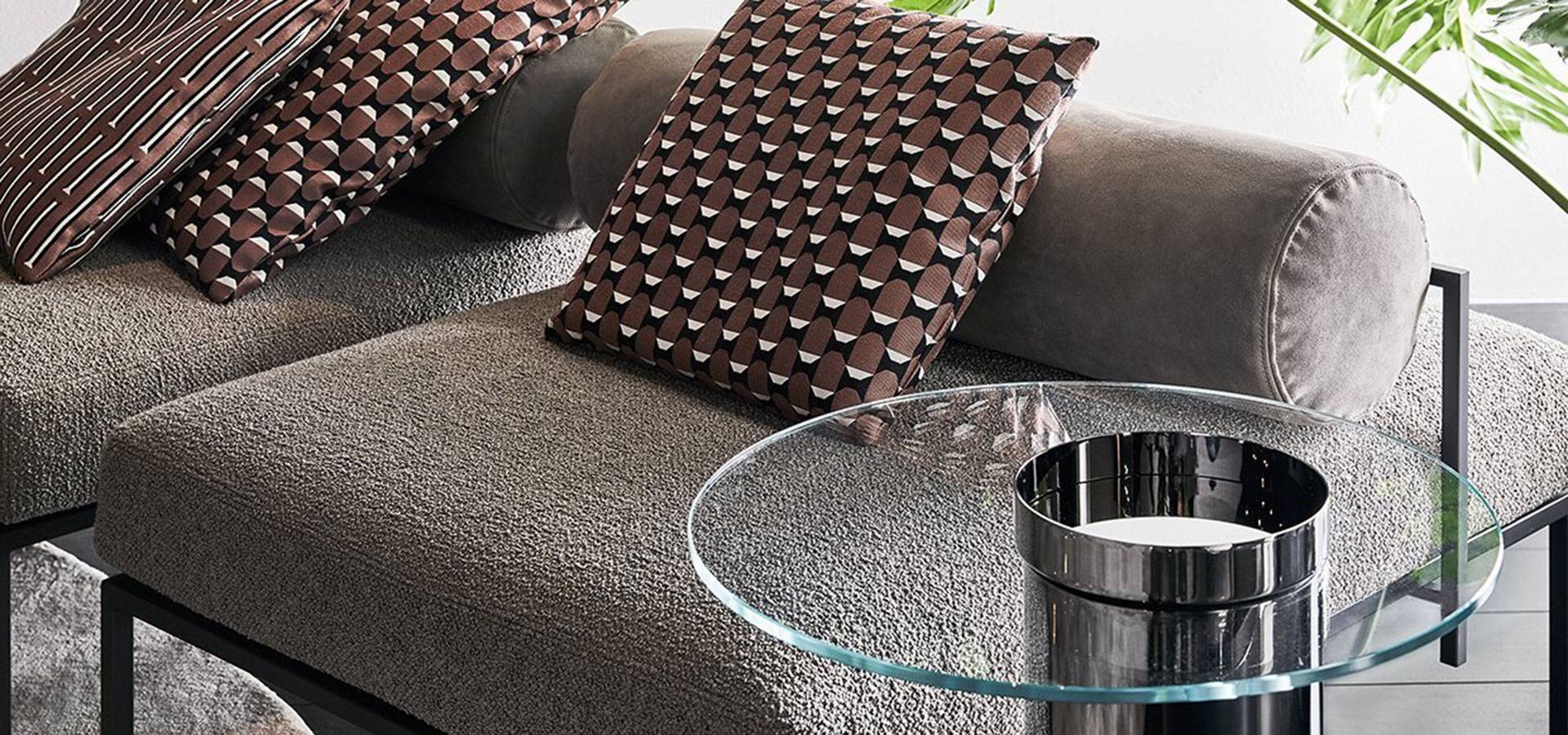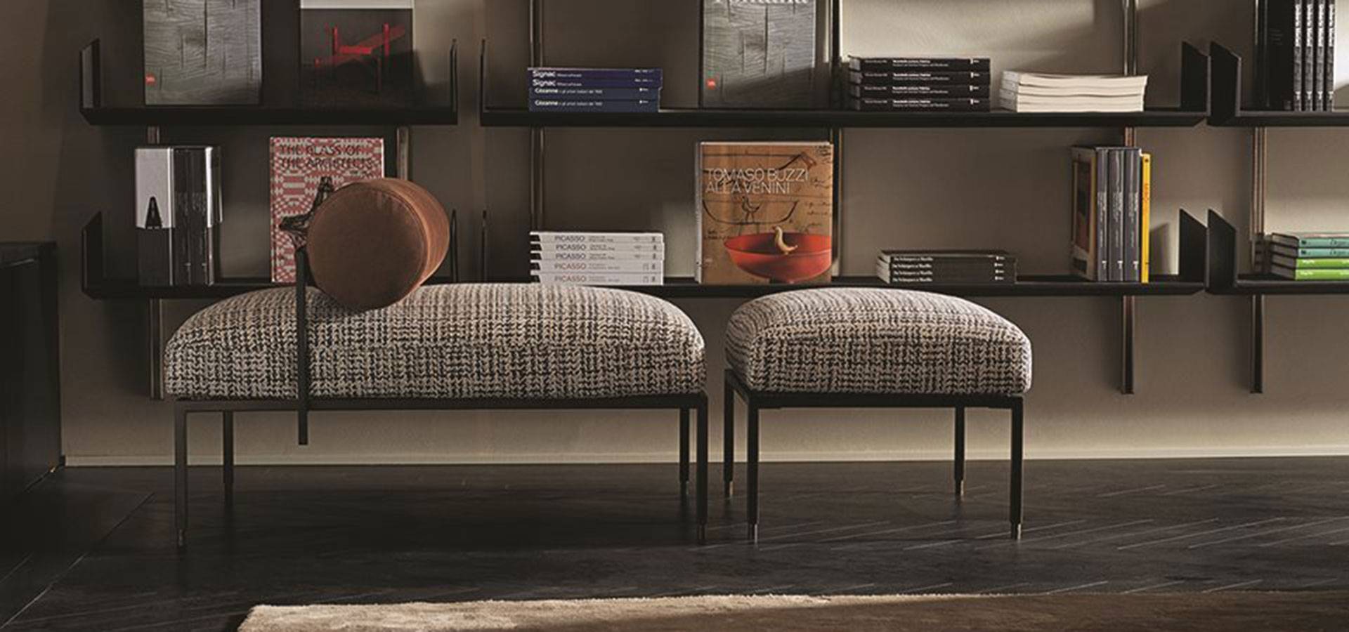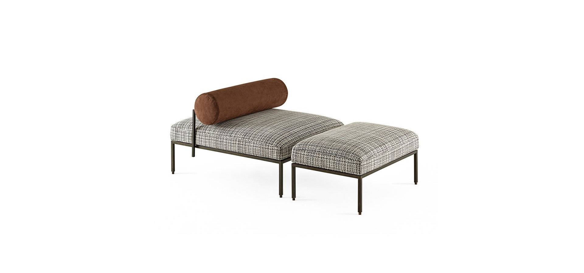 Bronzed black metal structure for the bench and pouf. Seat cushion made of non-deformable polyurethane foam in various densities and polyester fiber, with a fabric or leather back rollcushion, as samples show. Polyester fiber decorative cushions are available upon request.