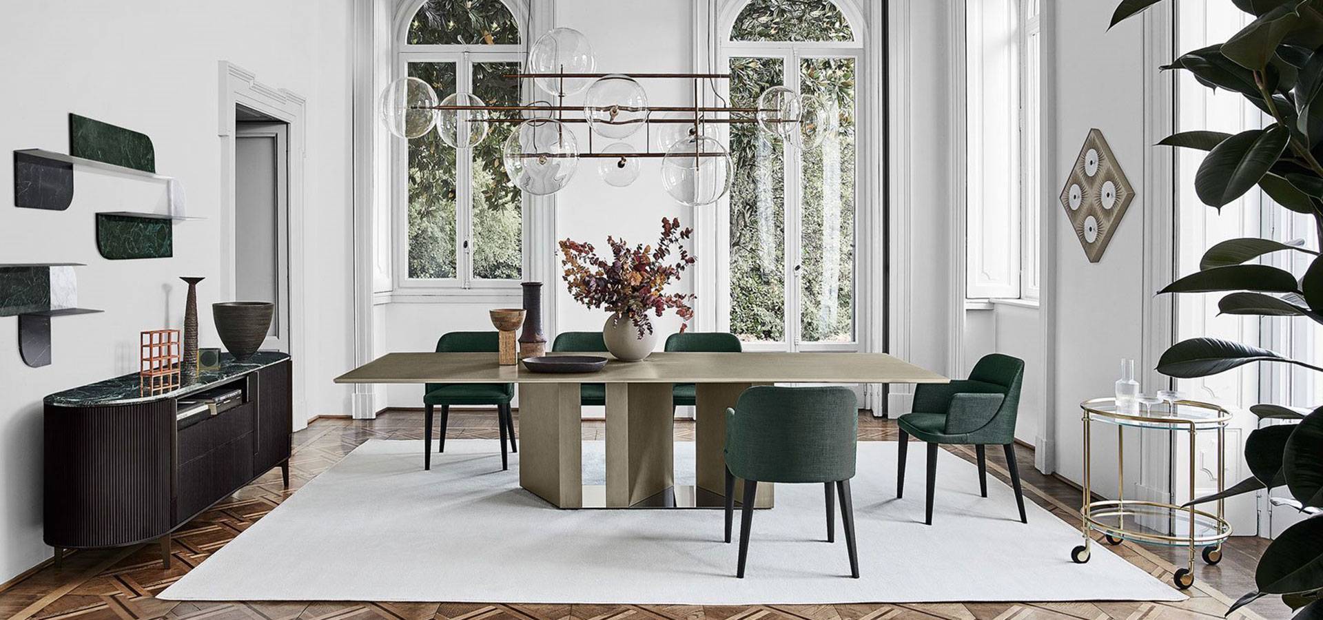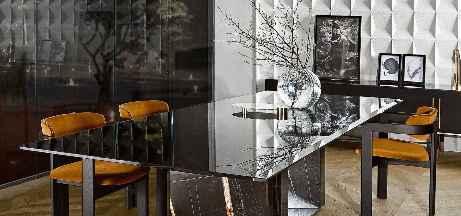 Table with a 15mm black painted glass top available in two finishes: brilliant and satin. Two sides of the top have 4cm bevelled edges. 20mm Sahara Noir marble on a wooden base with a "supermirror" bright stainless steel bottom plate. Also available with a 15mm glass top and a 6mm painted glass base in the colors black, blue grey, or liquorice, in the bright or satin finish, or painted with the distinctive "Cashmere" brushed finish in gold grey or anthracite.