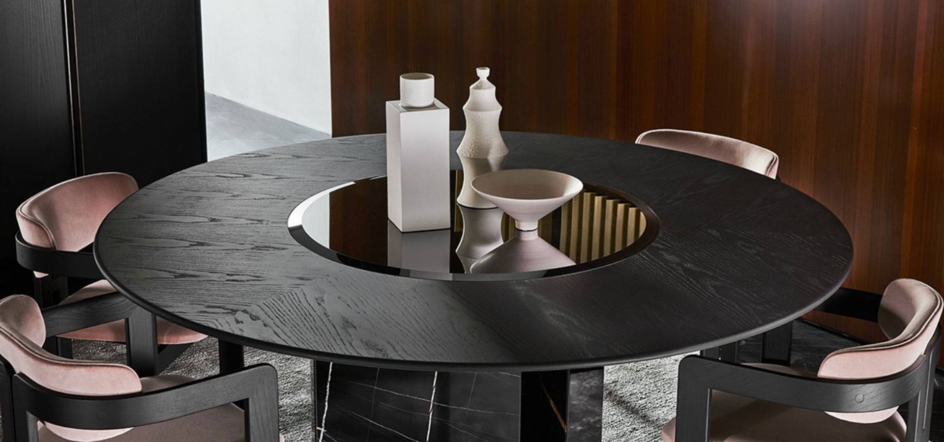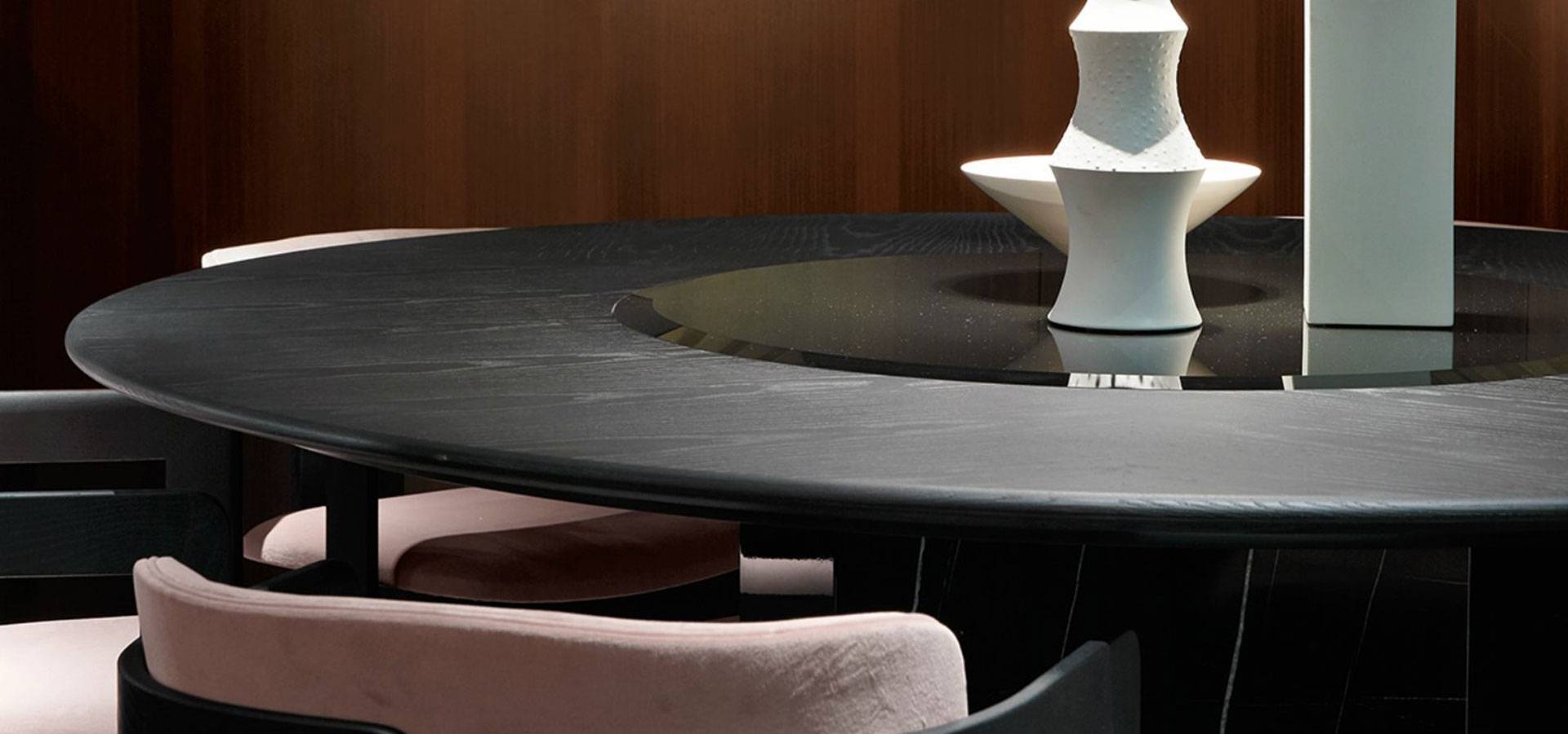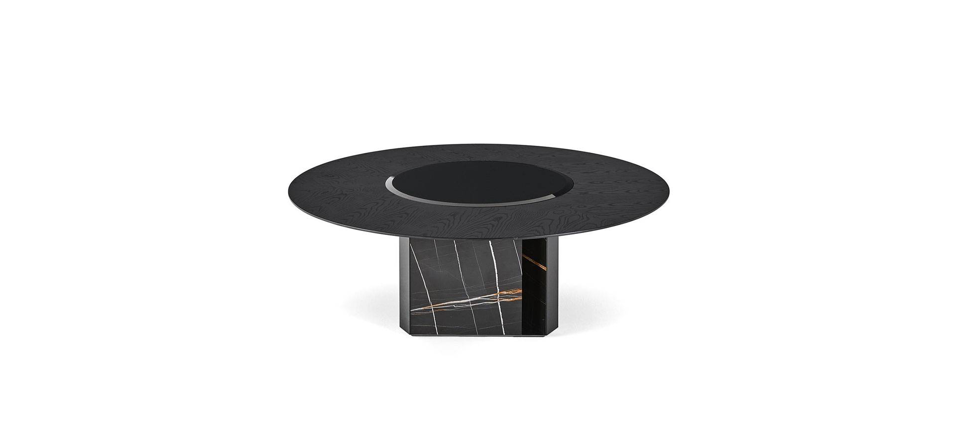 Table with brushed ash top stained black. 10mm tempered bevelled black bright painted glass rotating plate. Base in Sahara Noir marble. Bottom plate is brilliant stainless steel "Supermirror."