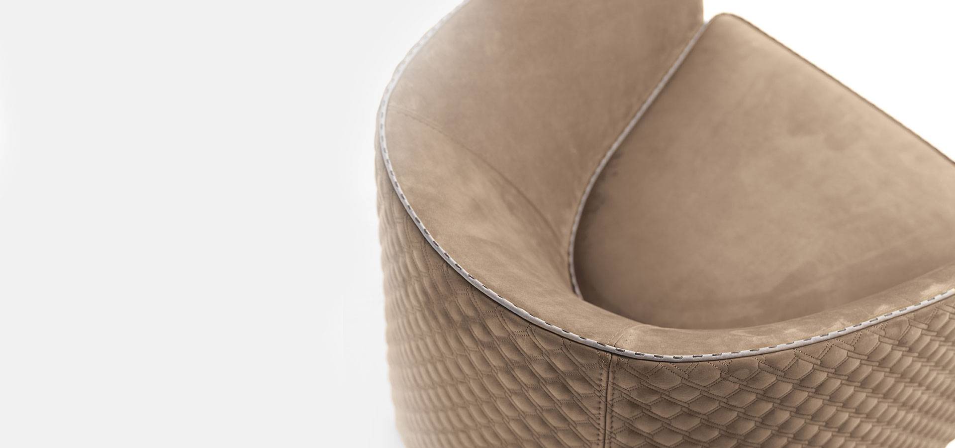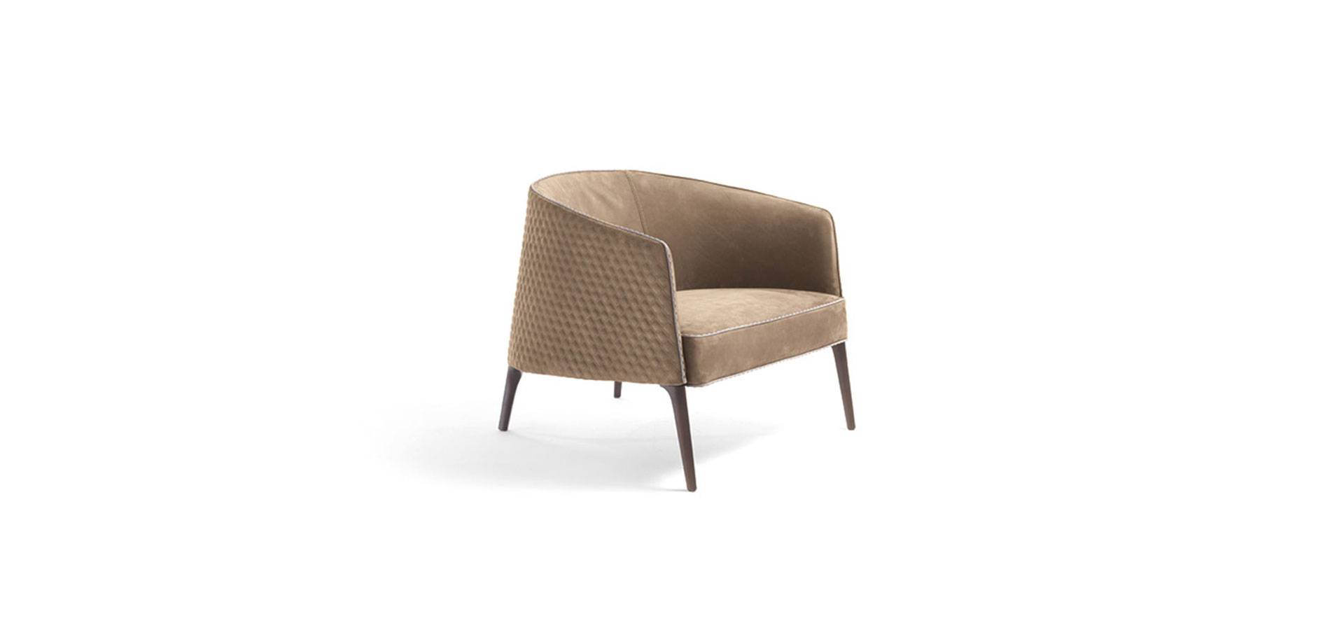 With a truncated cone form and a backrest that slopes softly towards the armrests, the Poggi armchair is a true passe-partout that adds refined elegance to both a living and sleeping room. The sartorial features of the external section of the backrest, with quilted inserts, improve the shapes for a pleasant touch, while the solid wood feet with a material effect raise the armchair for a light visual effect.