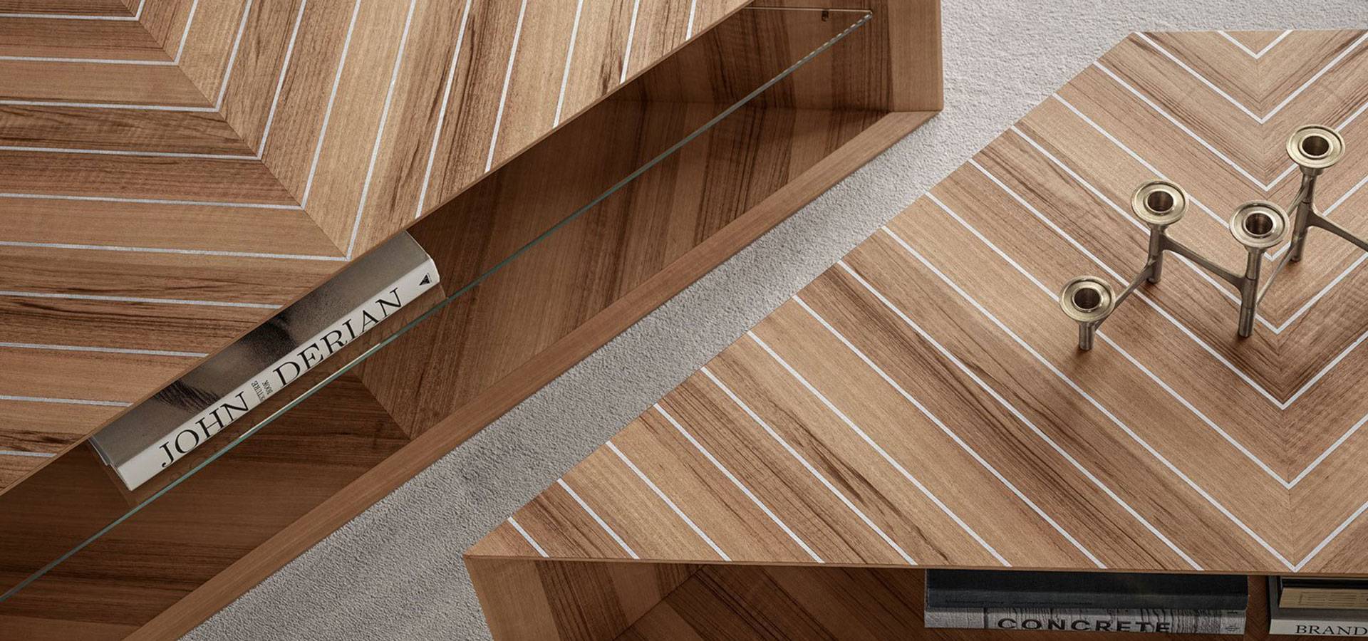 Marquetry of "Color" Frisè Walnut and natural aluminum or India Rosewood and natural aluminum on a wooden coffee table. Inside shelf is 8 mm thick extralight tempered in the 37 cm high variant. 40/47 cm h. Natural brushed Travertino Romano (not treated with resin) or natural gloss Verde Alpi marble are both options.