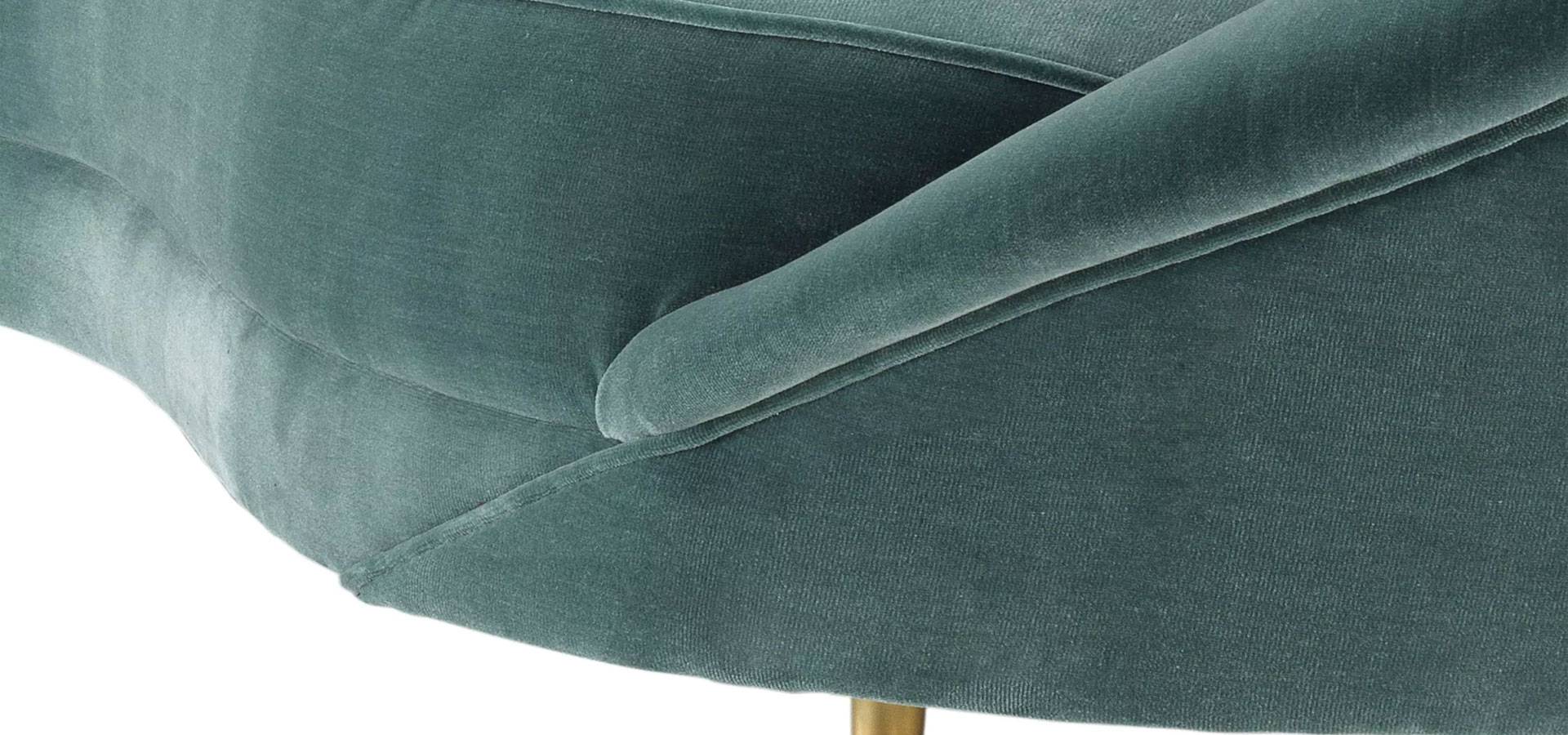 Relax to the max on the velvet soft Provocateur Sofa. Enjoy the supreme comfort and vintage charm of this curved asymmetric couch with Cameron deep turquoise velvet upholstery and elegant tapered brass feet.