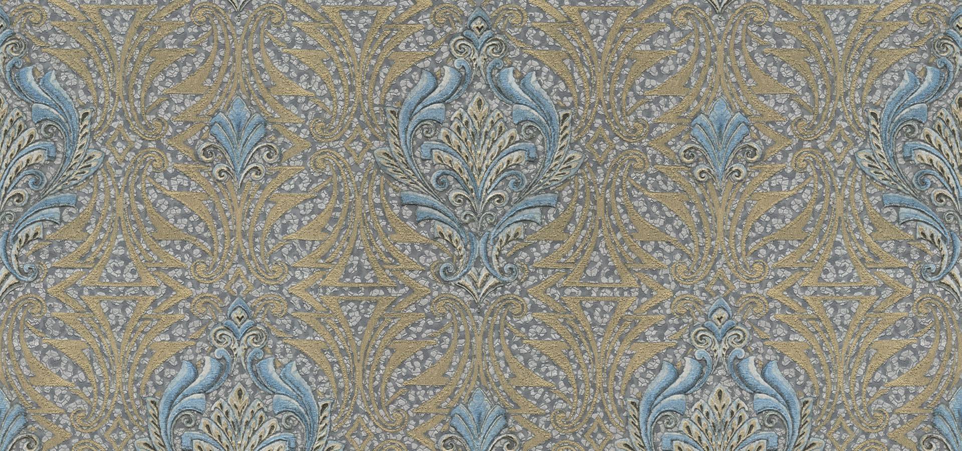 A striking heavyweight Italian vinyl wallpaper with an ornate damask design on top of a fake animal print. Contrasting blue and gold are shown here. This is a design with an exceptionally broad breadth.