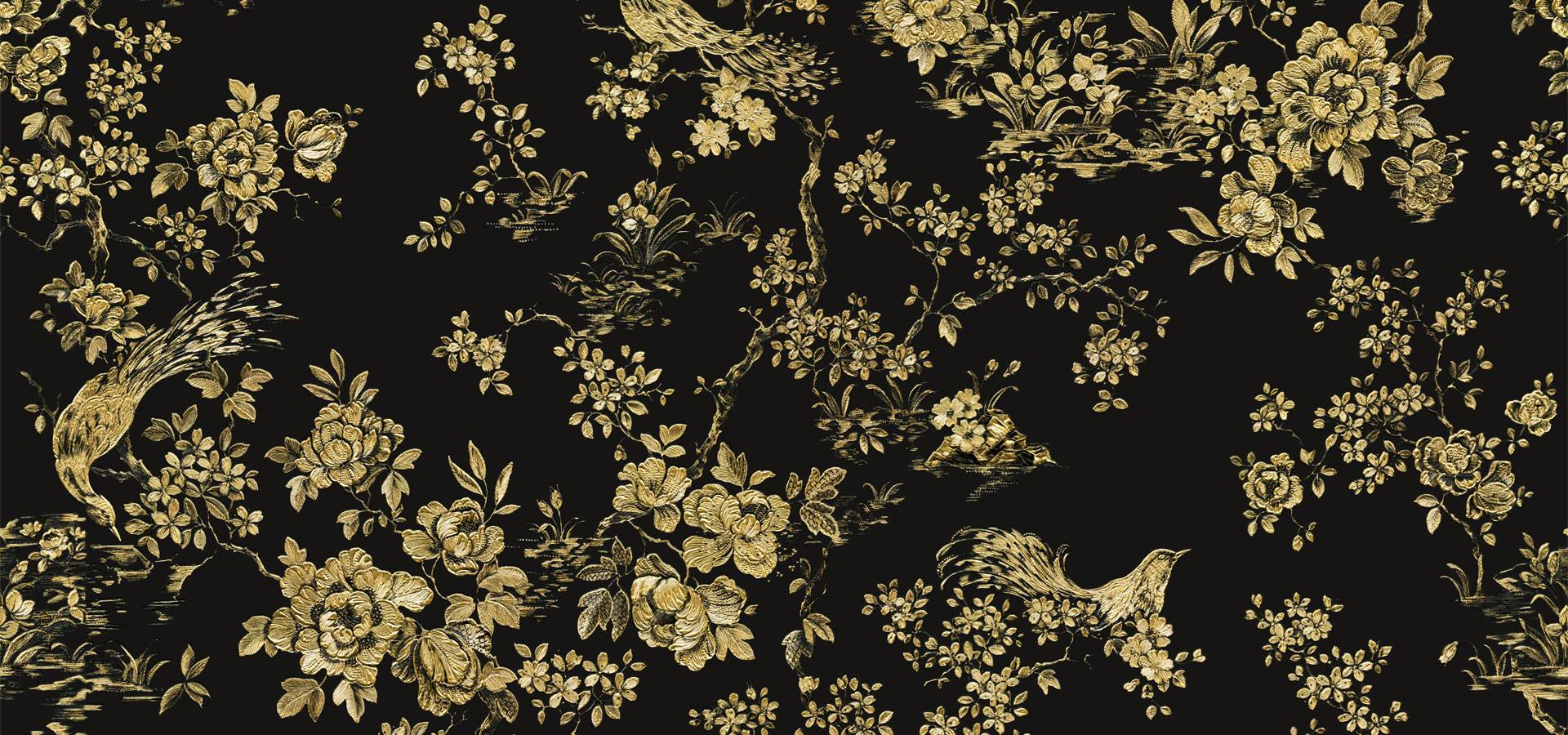 Black wallpaper with tree flower leaves and birds in gold colour that can help you create a soothing elegant luxury feeling in any room.